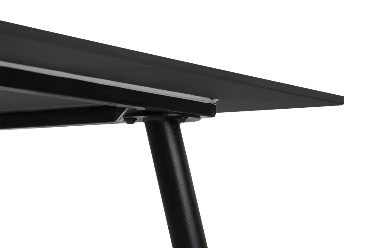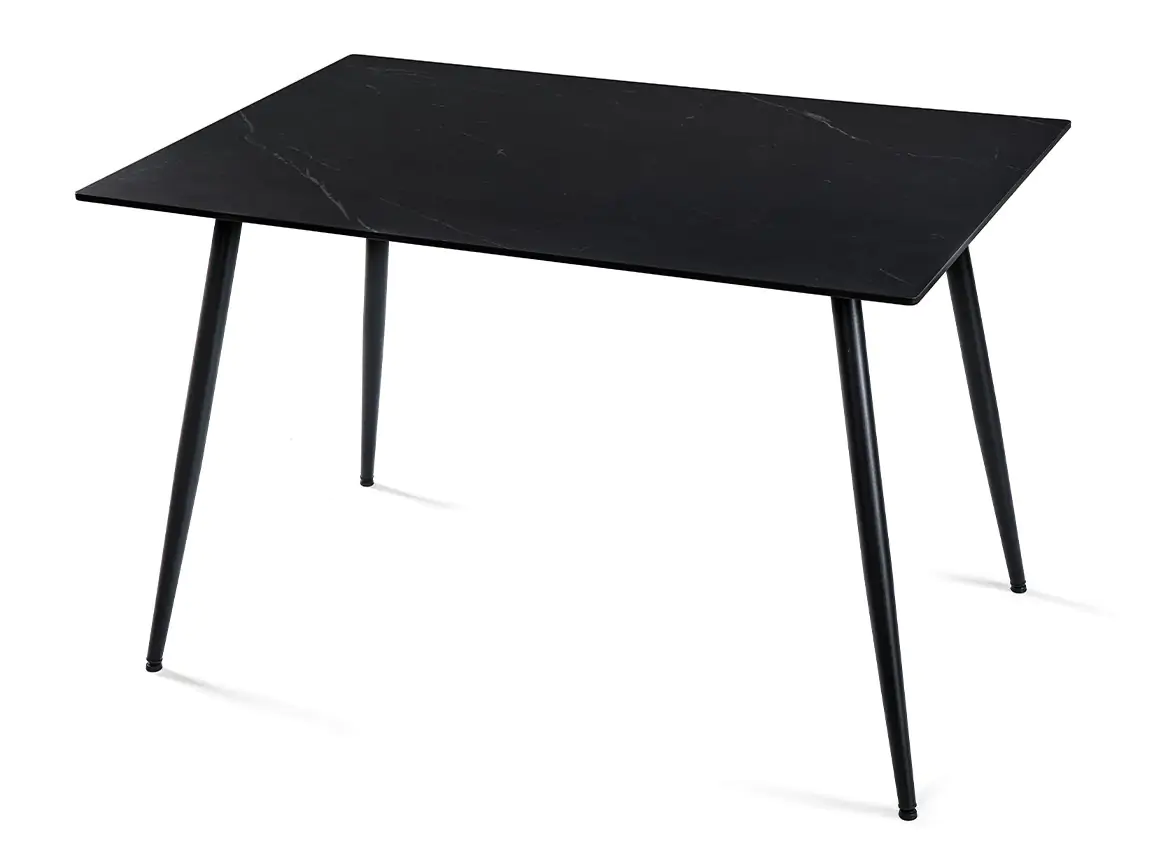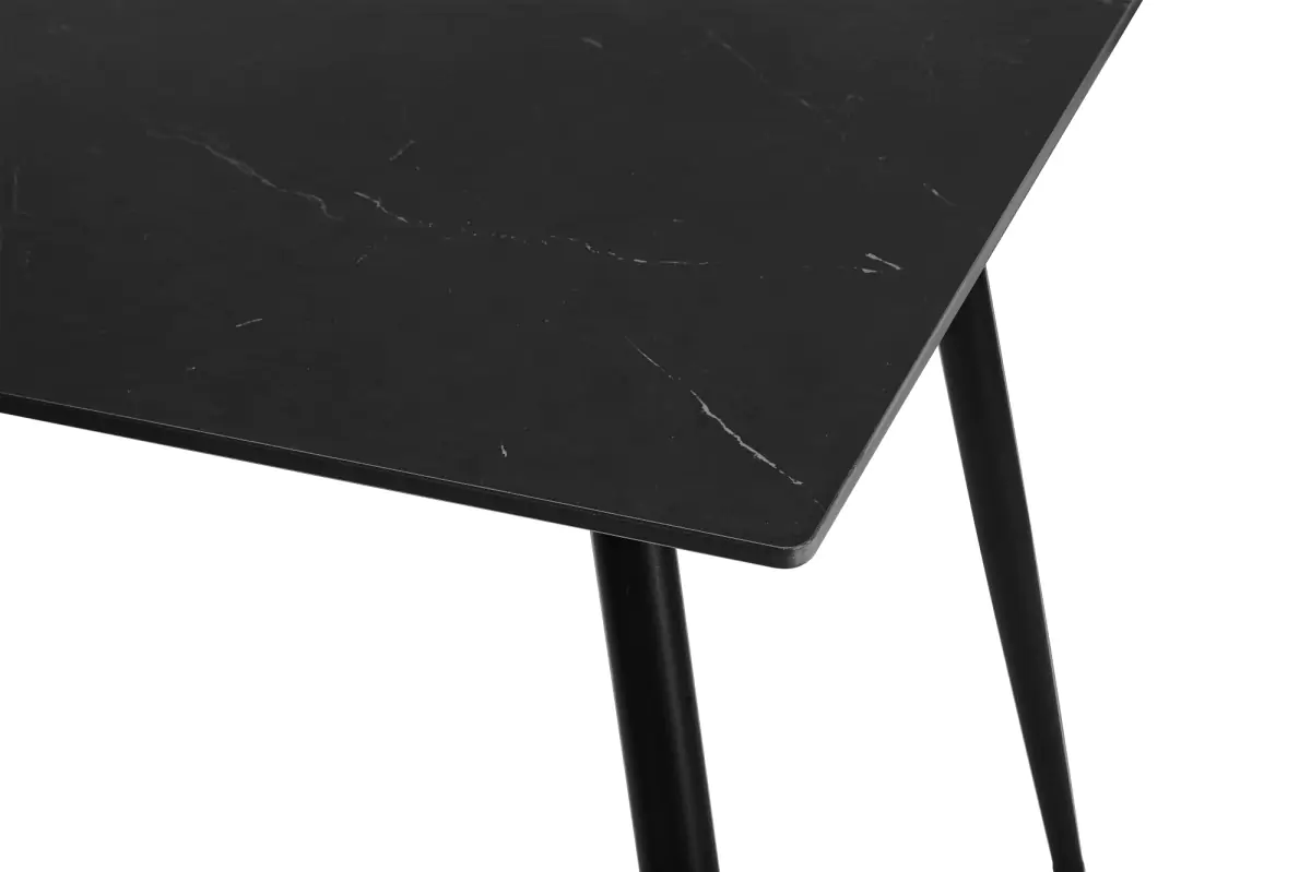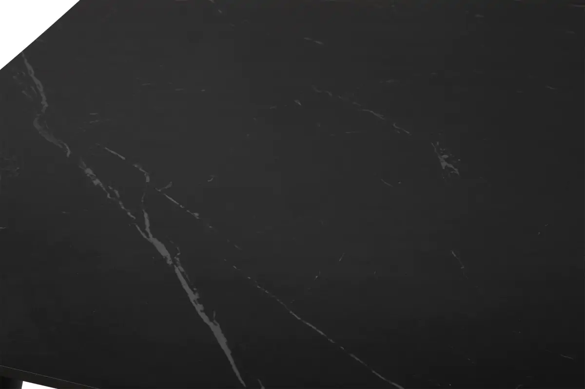 Deska v černé barvě z kvalitní slinuté keramiky v imitaci matného mramoru, která je odolná vůči poškrábání, působí luxusně a nadčasově. Stabilní kovové nohy v černém provedení.