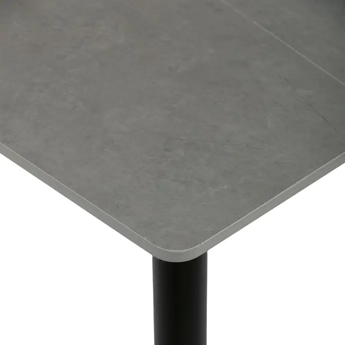 Deska je vyrobena z matné keramiky, která je snadno udržovatelná a odolná vůči poškrábání i vysokým teplotám. Stabilní kovové nohy v černém provedení jsou opatřeny rektifikačními patkami, které umožňují vyrovnání nerovností podlahy a zajišťují pevnou oporu. Minimalistický design s tenkou deskou a mírně zkosenými nohami podtrhuje současný styl nábytku.