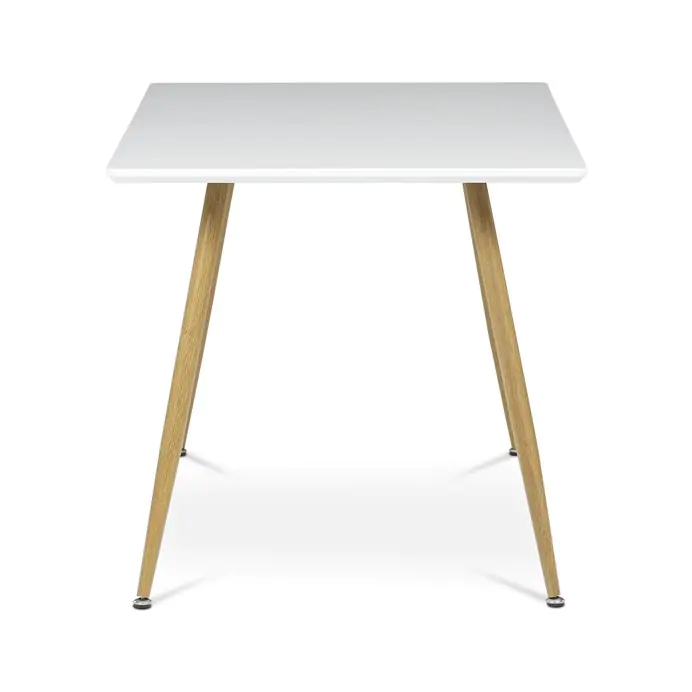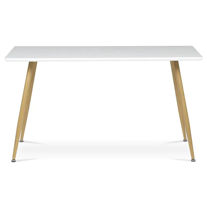 Bílá matná deska z MDF materiálu je odolná a snadno udržovatelná, zatímco stabilní kovové nohy v dekoru přírodního dubu dodávají stolu šarm.