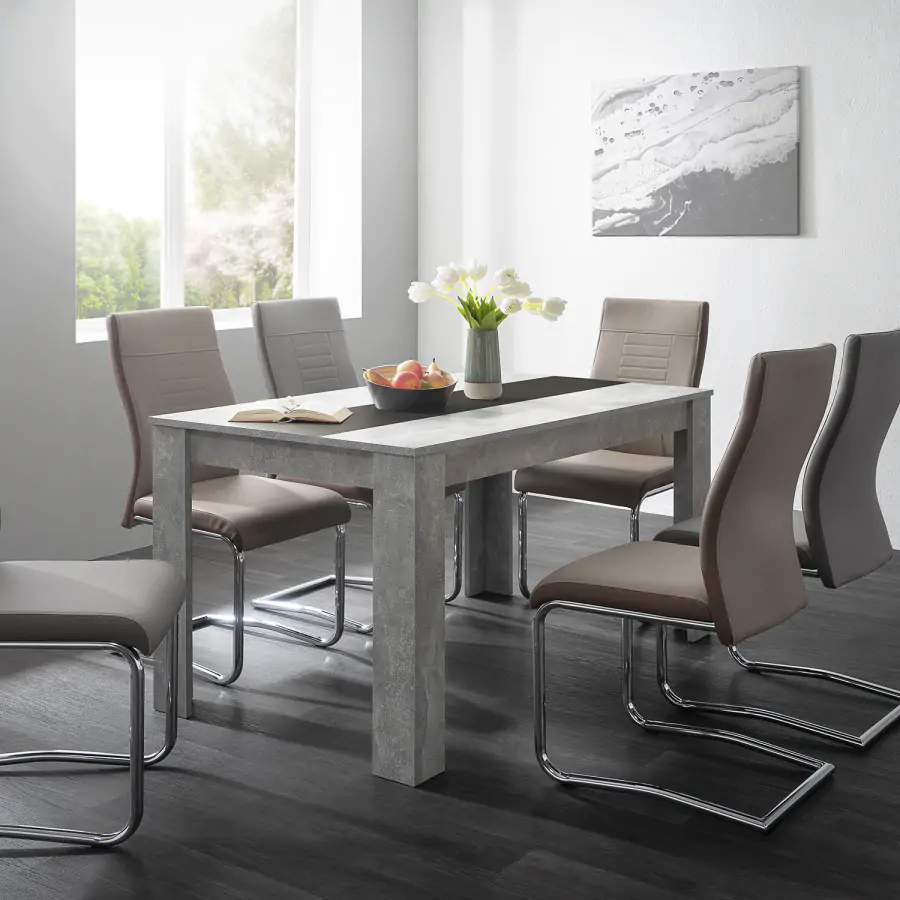 Jídelní stůl NIKOLAS v barevném provedení imitace betonu má zajímavě řešený prostřední díl, ten je oboustranný, takže si můžete vybrat bílou nebo černou barvu, dle prostírání.