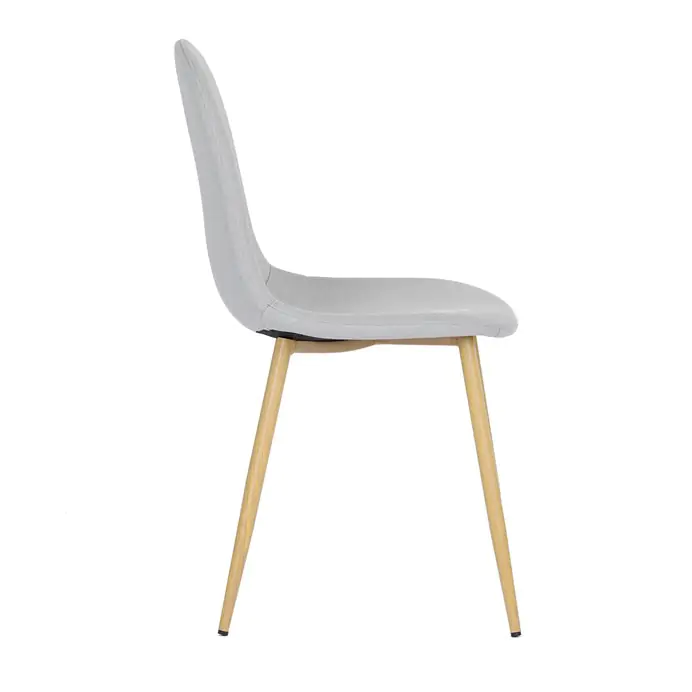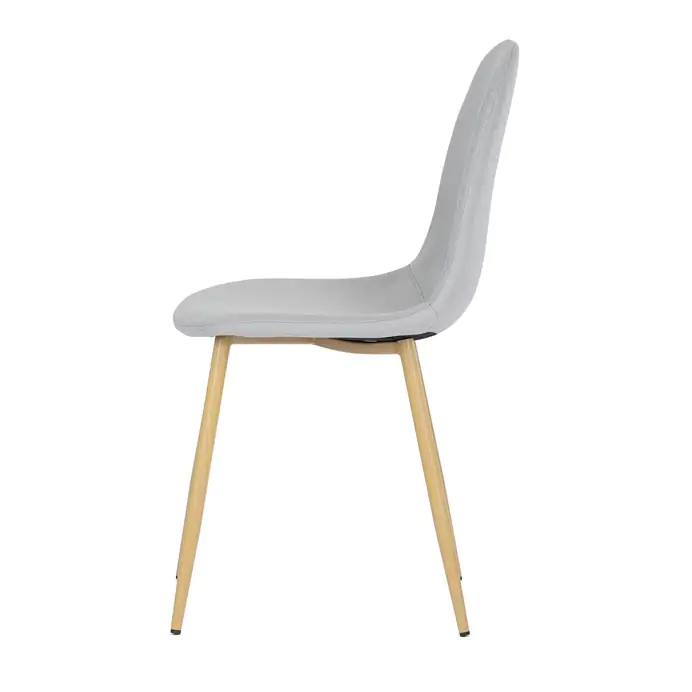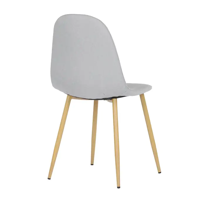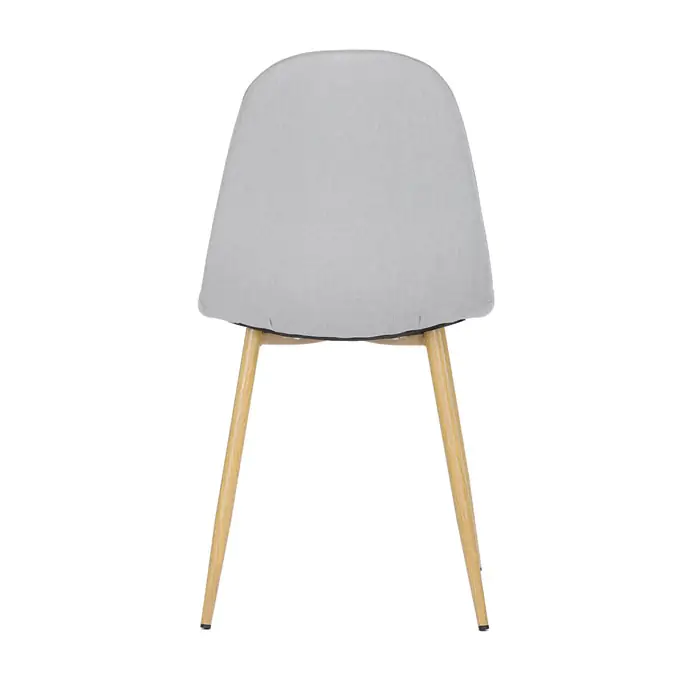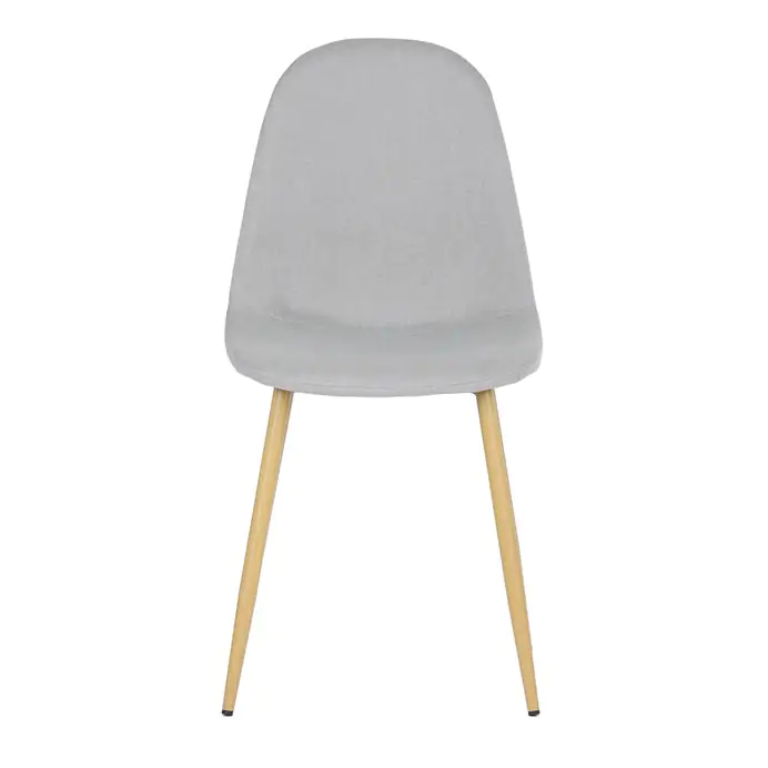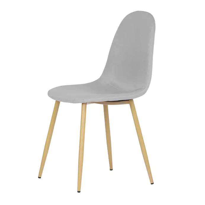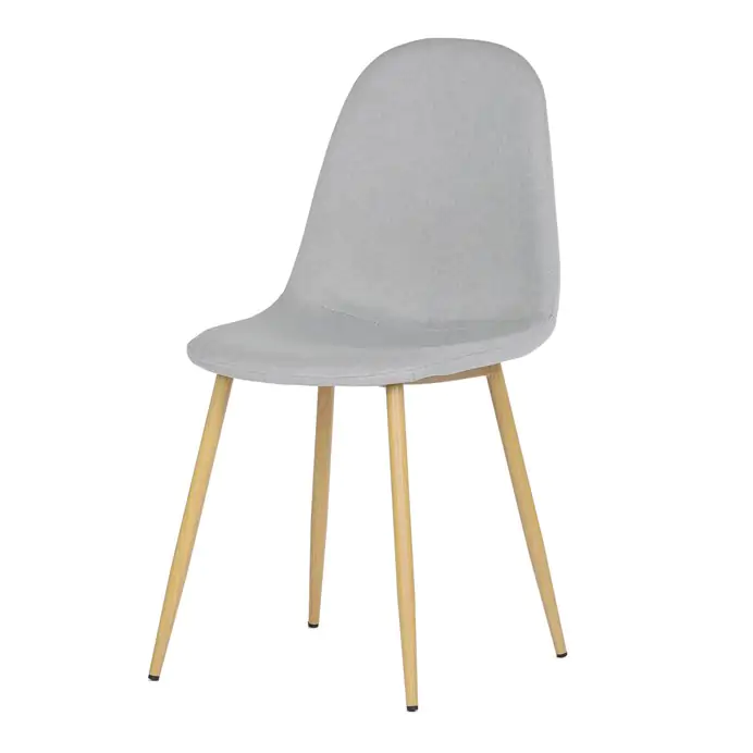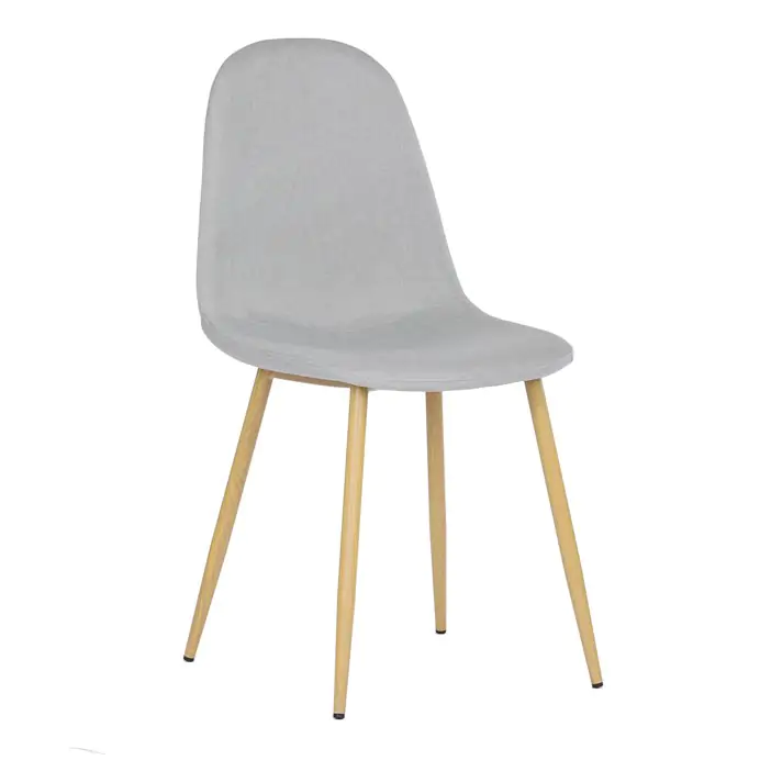 Sedák i opěradlo jsou čalouněné příjemnou látkou v neutrálním stříbrném odstínu, která se snadno udržuje a zajišťuje komfort při sezení. Kovové nohy s povrchovou úpravou připomínající dubovou dýhu poskytují pevnou a stabilní oporu.