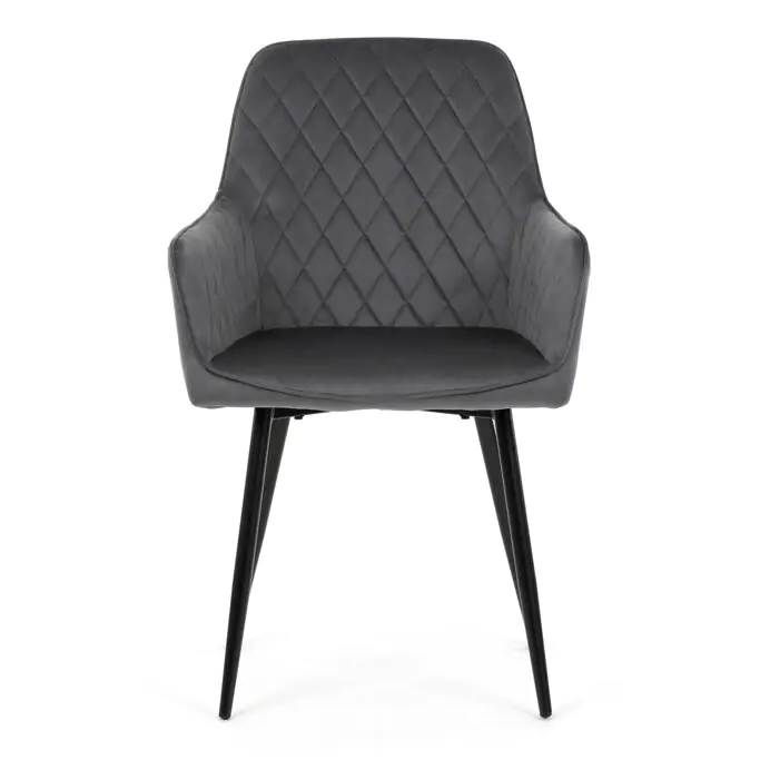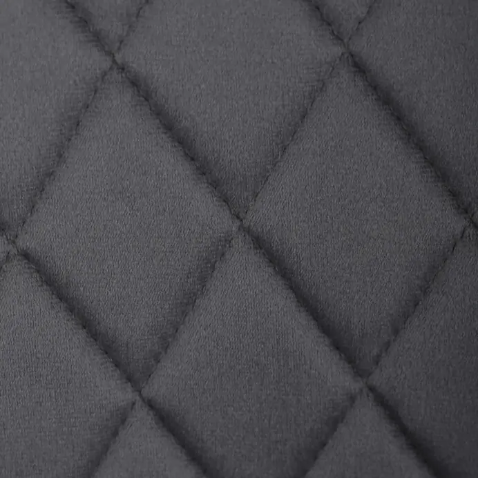 Jídelní židle DCH-215 GREY4 s potahem z šedé sametové látky nabízí příjemný dotek a vizuálně zajímavý design díky prošívání v kosočtvercovém vzoru na opěradle i područkách.