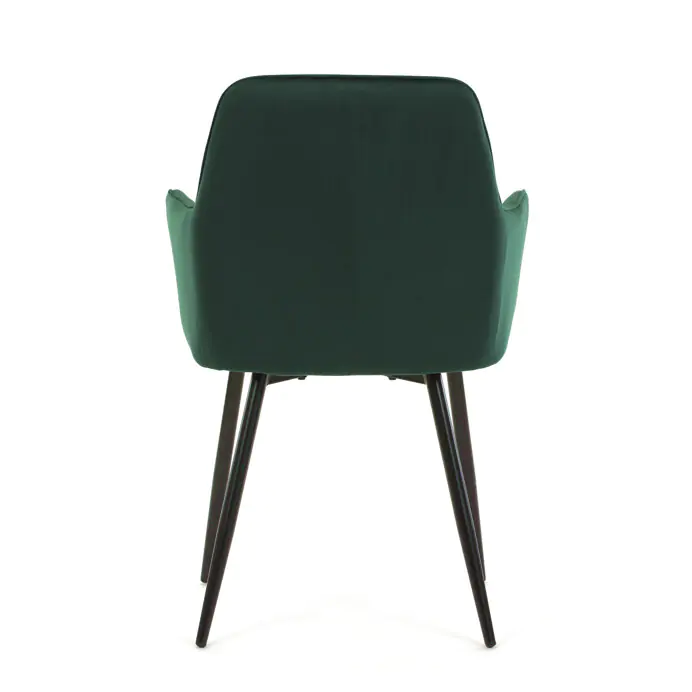 Pevné černé kovové nohy zajišťují stabilitu a dlouhou životnost, zatímco integrované područky přispívají k vyššímu komfortu při sezení. Židle je určena pro použití v jídelnách, kuchyních či kavárnách, kde kombinuje estetiku s funkčností.