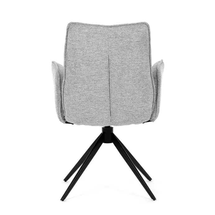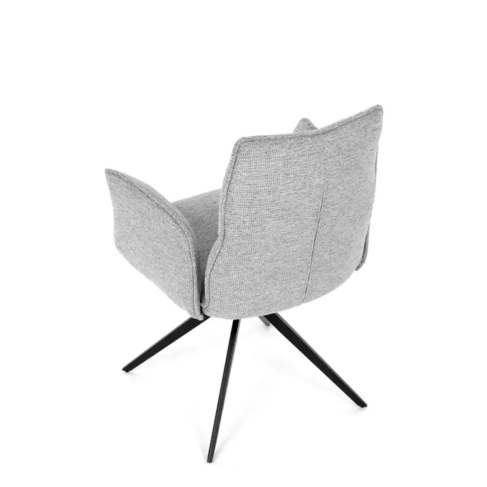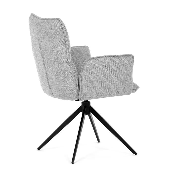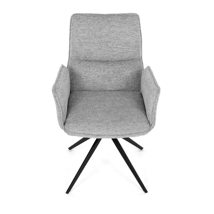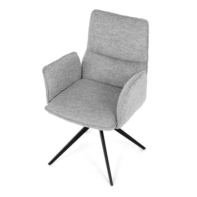 Čalounění z kvalitní šedé látky poskytuje příjemný a měkký povrch, který je zároveň odolný vůči běžnému opotřebení. Konstrukce židle je podpořena pevnou kovovou podnoží v černé barvě, která zajišťuje stabilitu a dlouhou životnost. Integrované područky jsou ergonomicky tvarované a čalouněné stejným materiálem jako sedák a opěradlo, což zvyšuje komfort při delším sezení. Sedák i opěradlo jsou vyplněny hustou pěnou, která poskytuje dostatečnou oporu a pohodlí. Díky kompaktním rozměrům a elegantnímu vzhledu je židle vhodná do moderních jídelních prostor i kancelářských zasedacích místností. Nosnost židle odpovídá standardním požadavkům pro běžné uživatele, což z ní činí univerzální řešení pro různé typy interiérů.