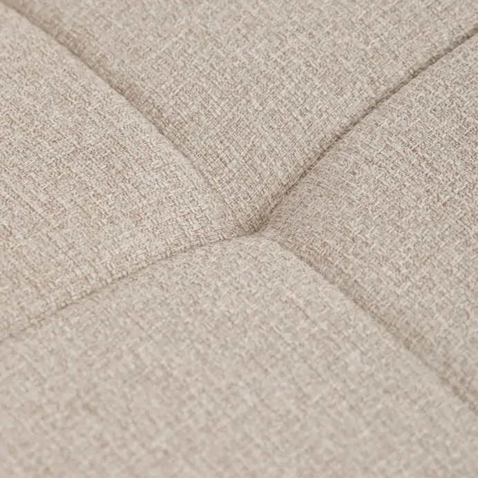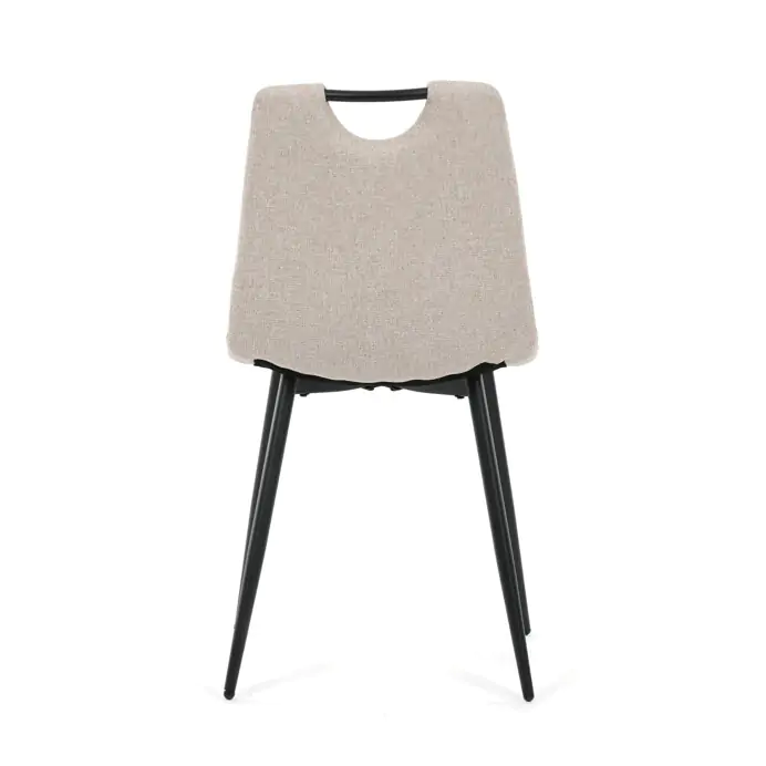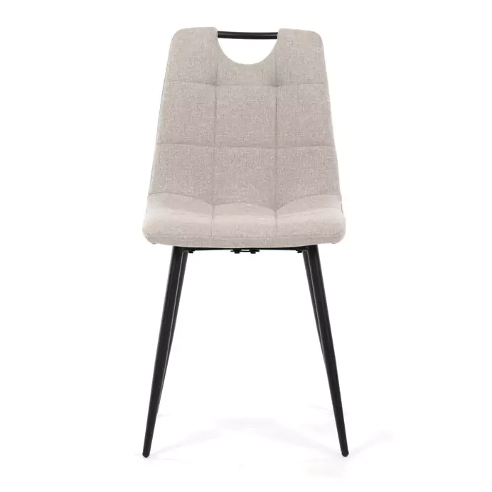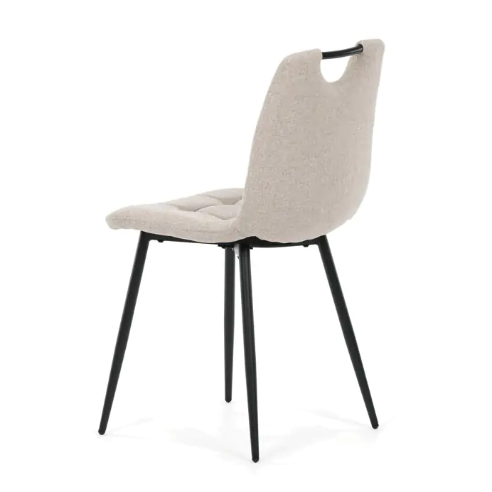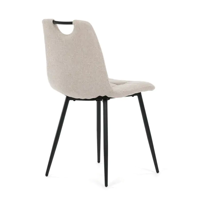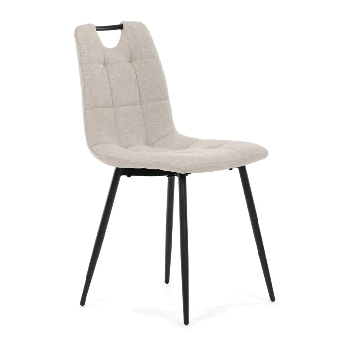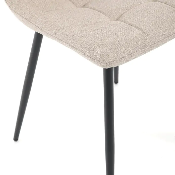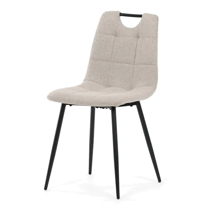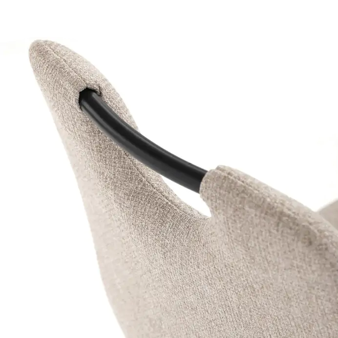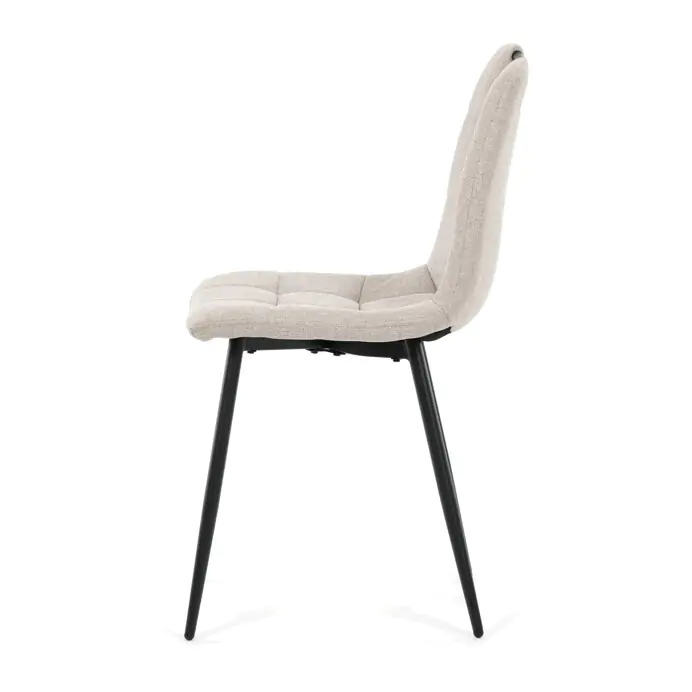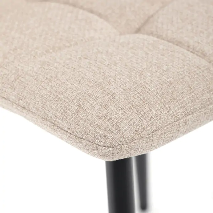 Sedák a opěradlo jsou potažené béžovou látkou, která je snadno udržovatelná a doplněná designovým prošitím pro zvýraznění estetického dojmu. Pevné kovové nohy s matnou černou povrchovou úpravou zajišťují stabilitu a dlouhou životnost.