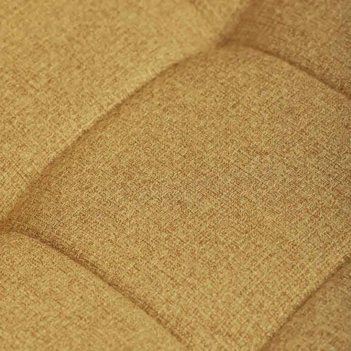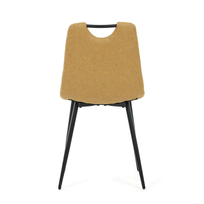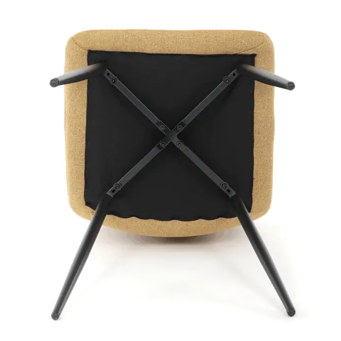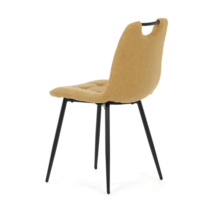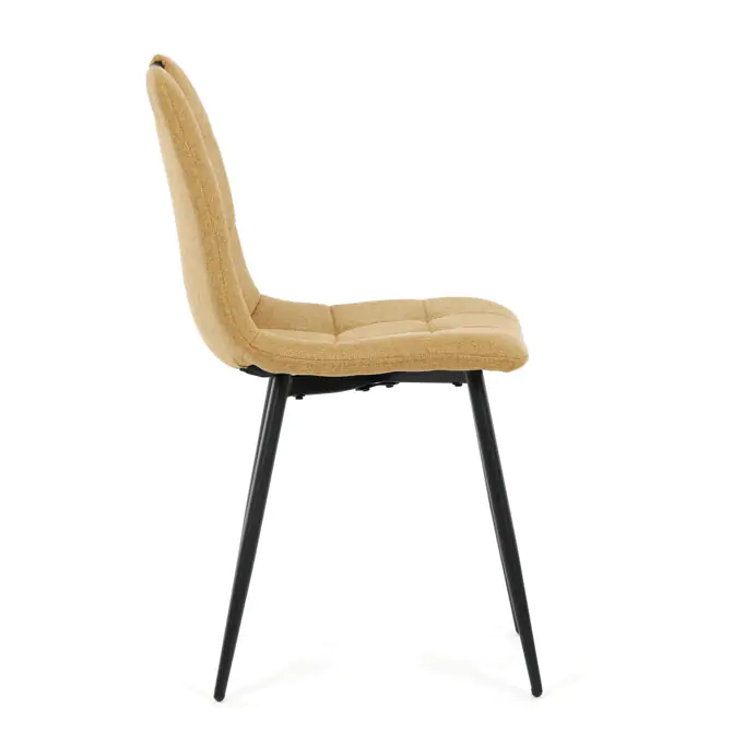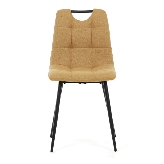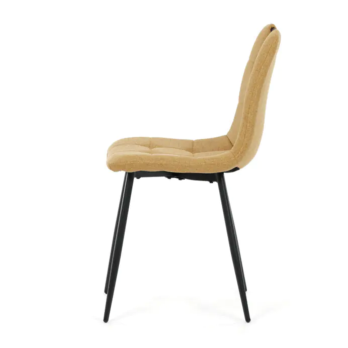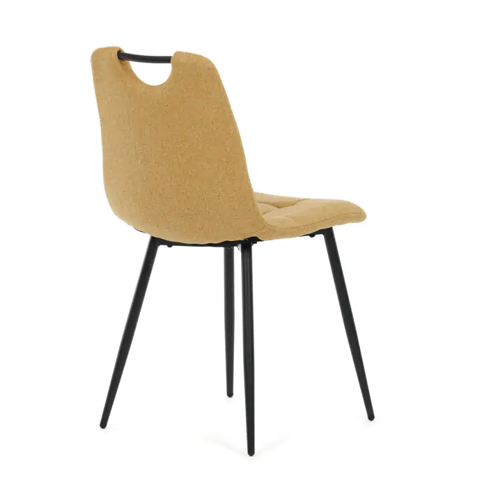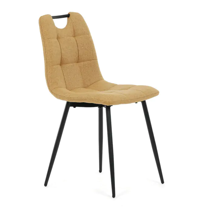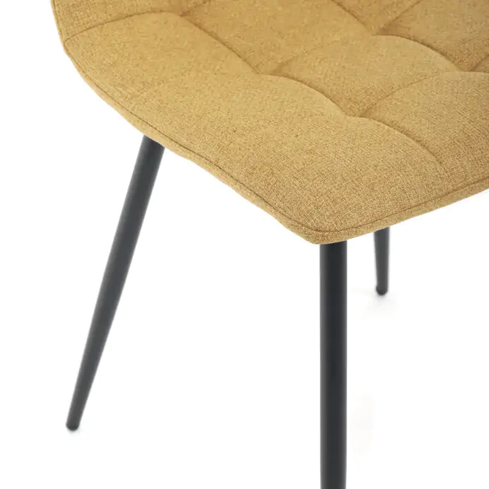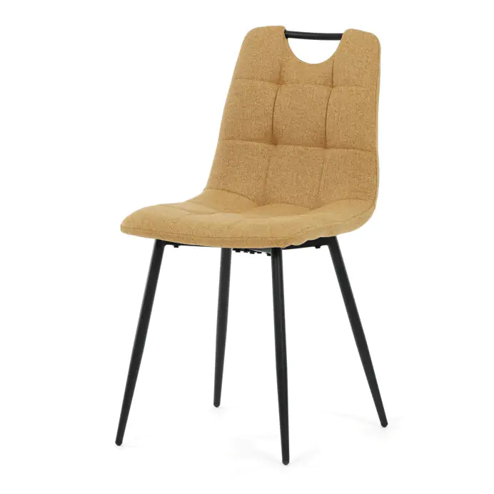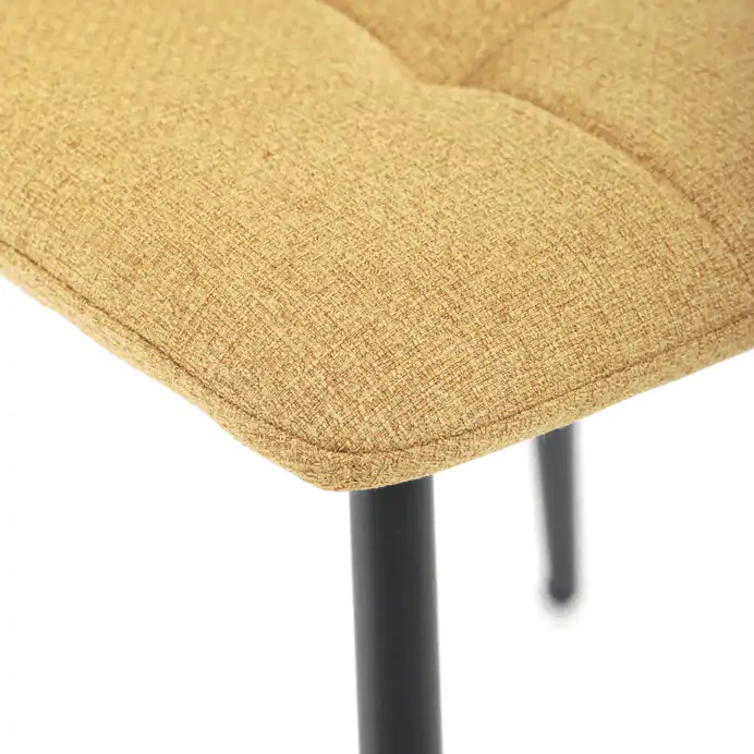Sedák a opěradlo jsou potažené žlutou látkou, která je snadno udržovatelná a doplněná designovým prošitím pro zvýraznění estetického dojmu. Pevné kovové nohy s matnou černou povrchovou úpravou zajišťují stabilitu a dlouhou životnost.