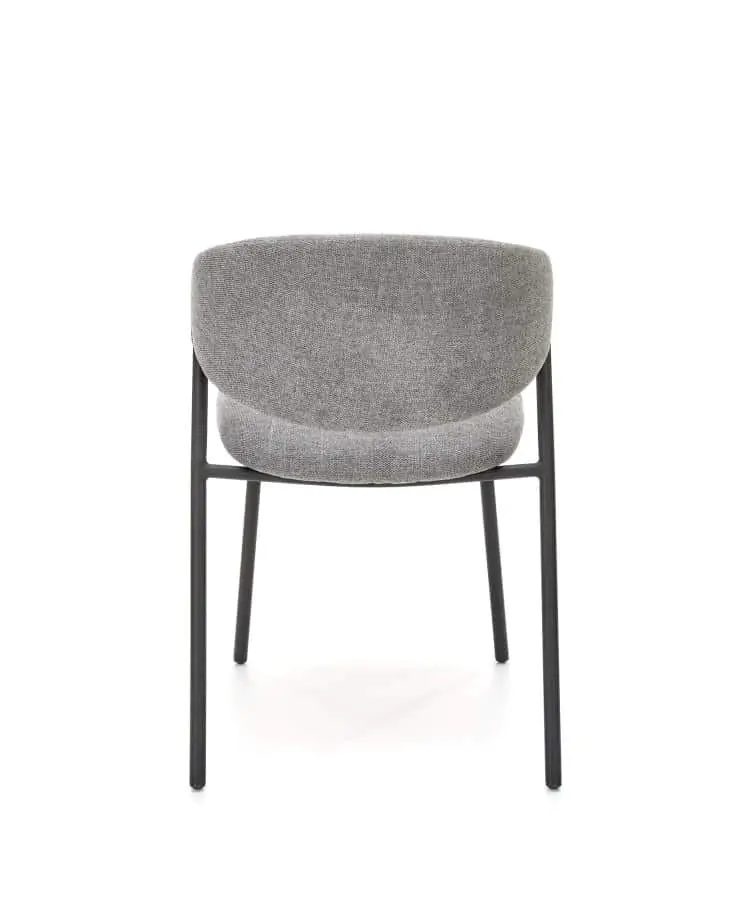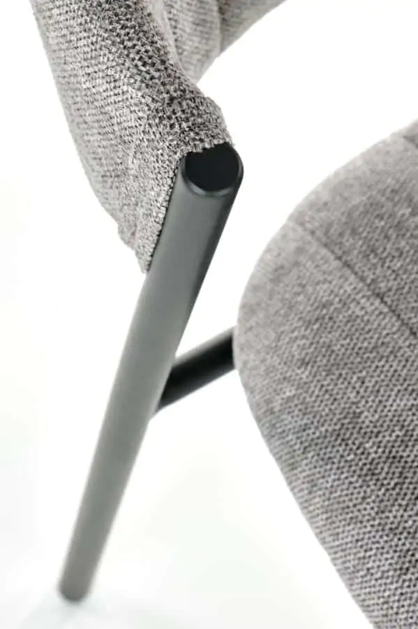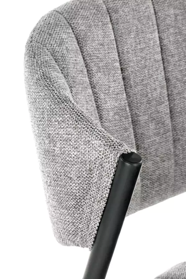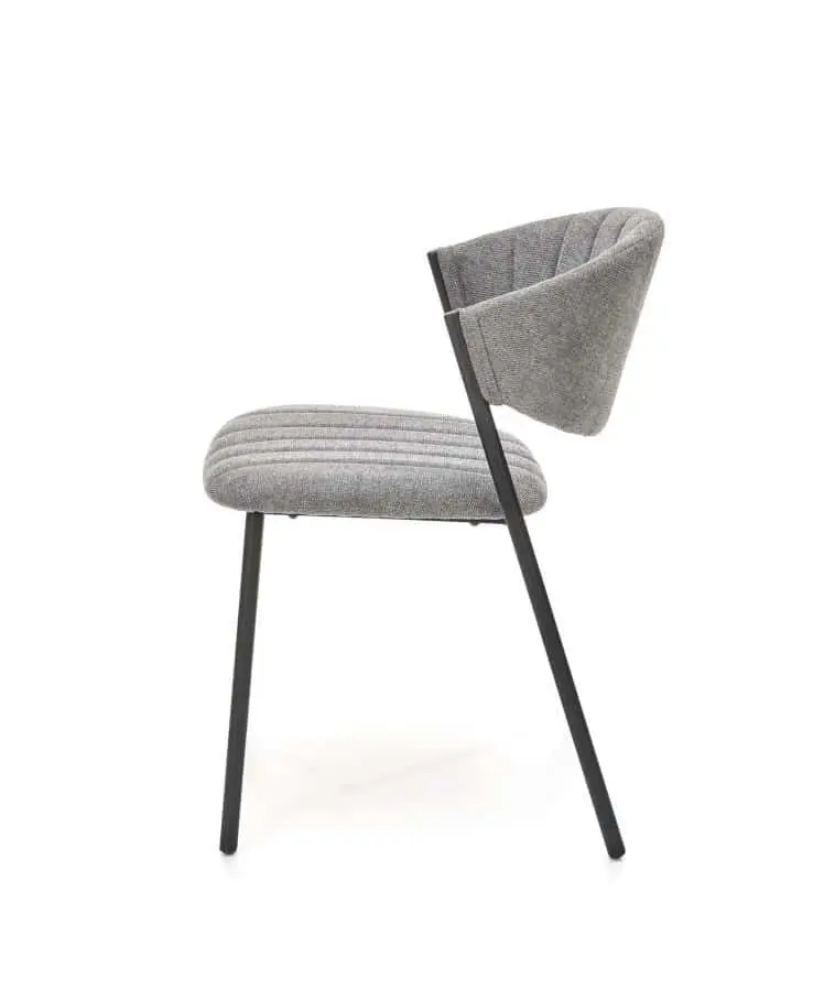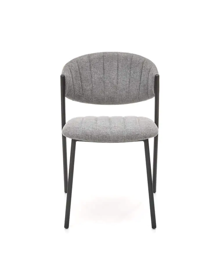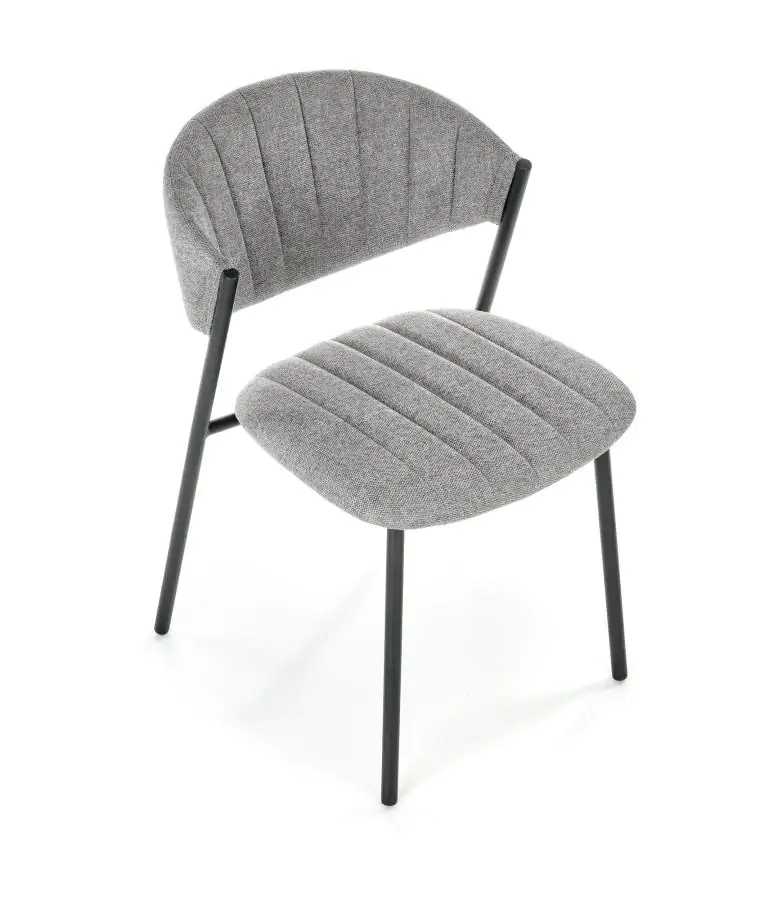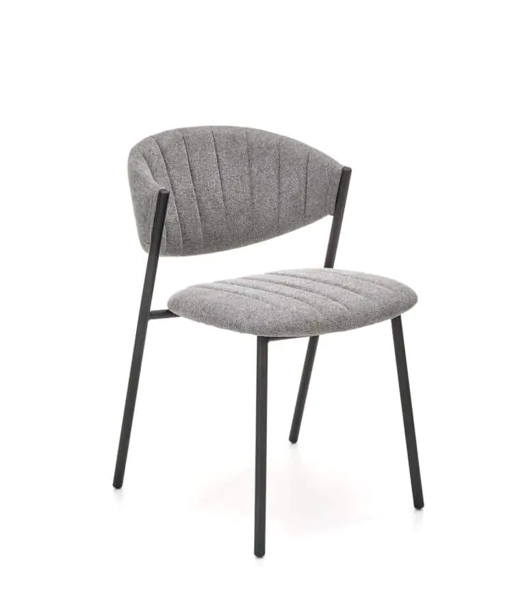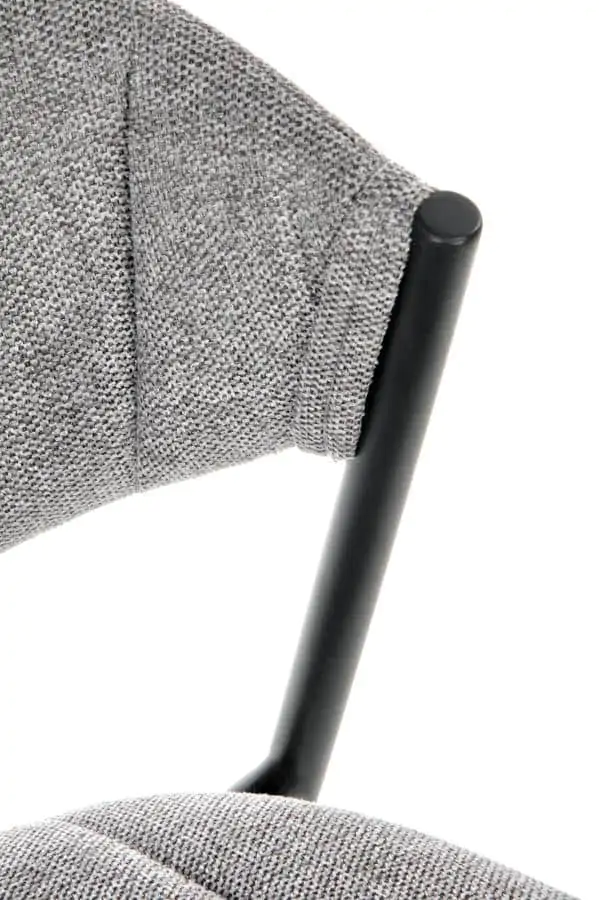 Jídelní židle K469 zaujme na první pohled svým tvarem a dekorativním prošitím. Je čalouněna příjemnou neutrální šedou látkou. Stabilitu zajišťují kovové nohy v černé barvě. Dodávané v demontu.