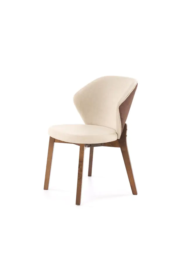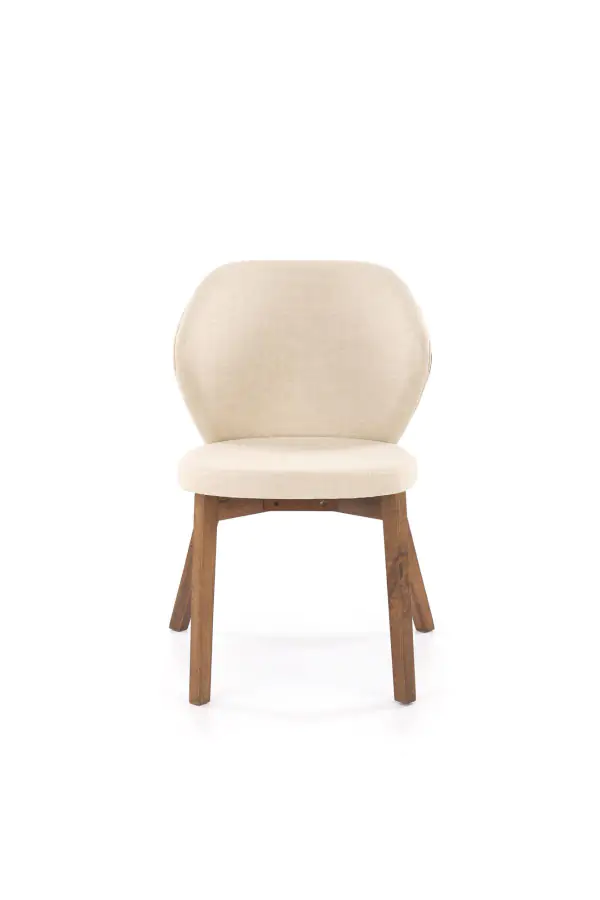 Sedák i opěrák jsou potaženy příjemným čalouněním v béžové barvě, které působí svěže a útulně. Dekorativní hnědý prvek na zadní straně opěráku podtrhuje elegantní kontrast a dodává židli jedinečný charakter.