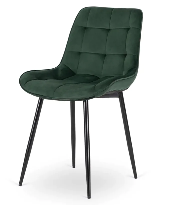 Moderní jídelní židle Chris s čalouněnou skořepinou v zelené látce welur a kovovou černou podnoží se stane neodmyslitelnou součástí jídelního koutu, jídelny, i obývacího pokoje!