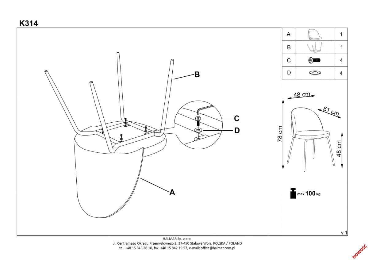 Jídelní židle K314 je zhotovena v kombinaci kovové podnože z práškované ocele v černé barvě a čalouněného sedáku a opěráku tmavě šedou potahovou látkou. Nosnost židle je 100 kg. Dodáváno v demontu.