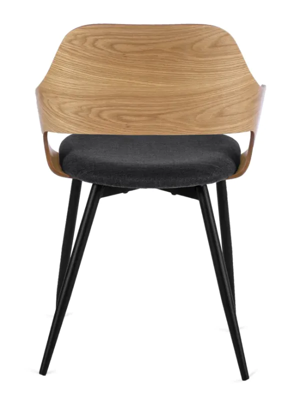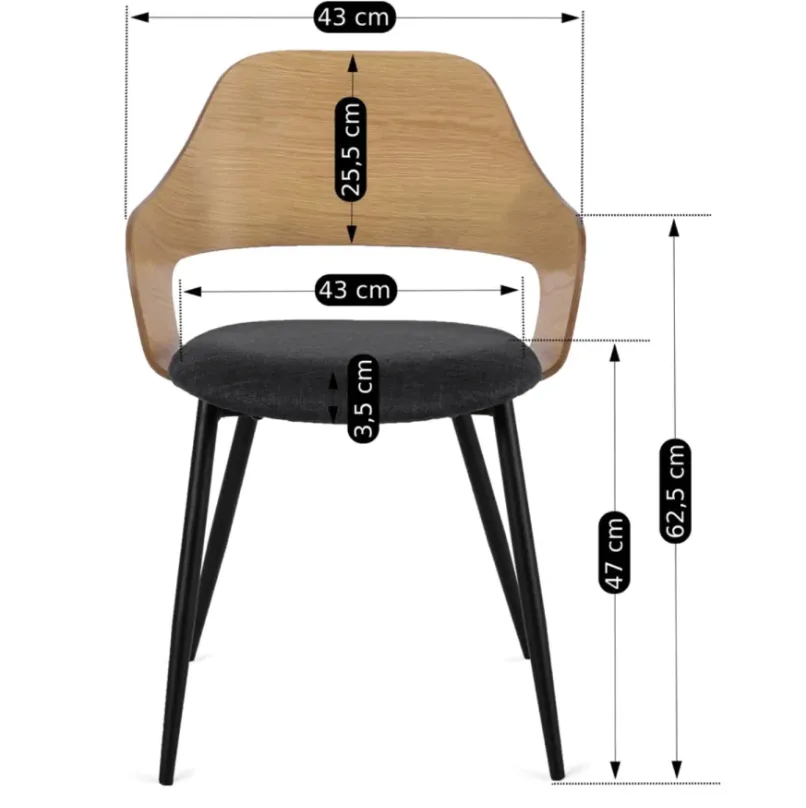 Skořepina v dubovém dekoru, je doplněna o komfortní podsedák s čalouněním a 4 kovové nohy černé barvy.