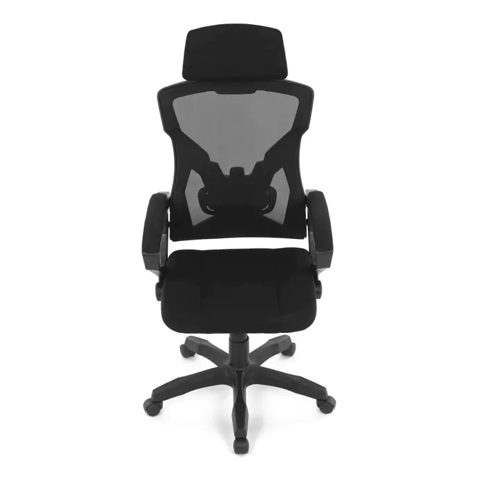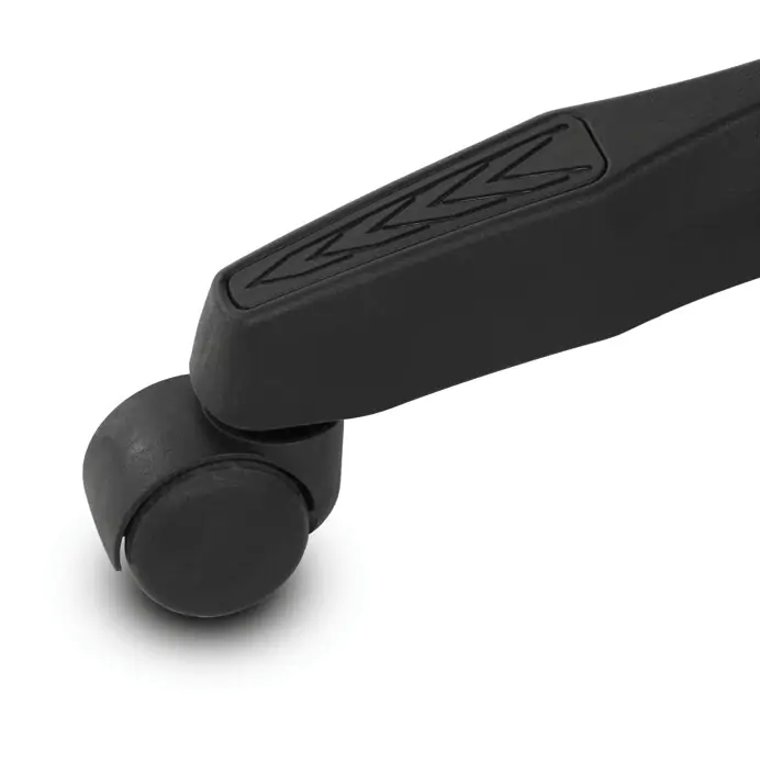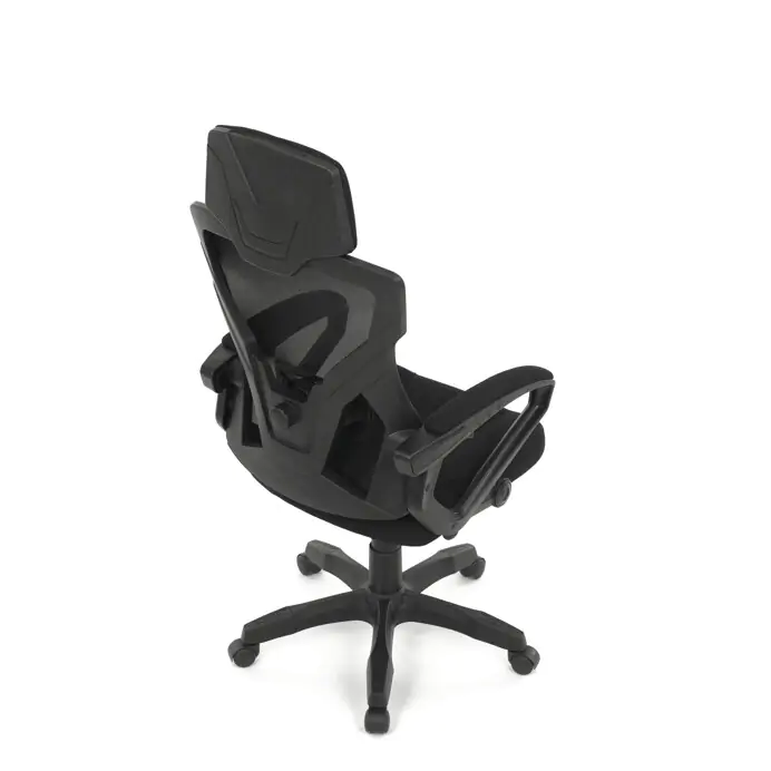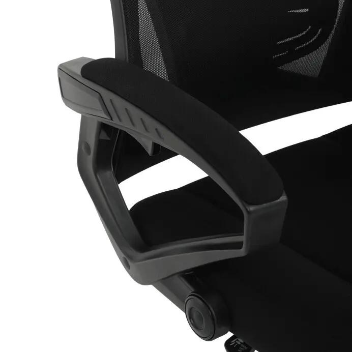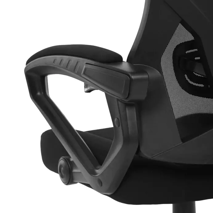 Pevný plastový kříž poskytuje stabilní základnu, zatímco čalouněné pevné područky přispívají k pohodlí paží. Opěrák je vybaven nastavitelným sklonem a integrovanou bederní opěrkou, která podporuje správné držení těla. Výškově nastavitelná mechanika umožňuje snadné přizpůsobení výšky sedáku individuálním potřebám uživatele. Křeslo je vhodné pro dlouhodobé používání s důrazem na ergonomii a stabilitu.