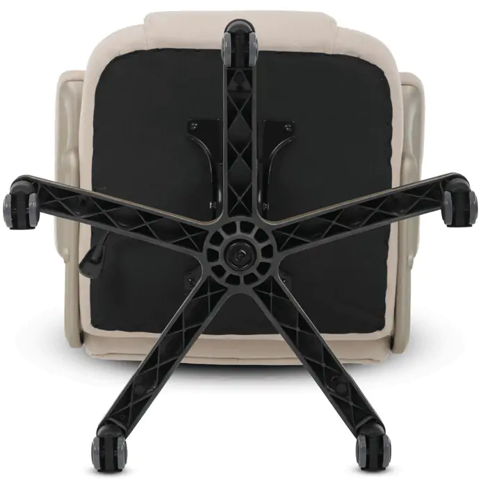 Stabilní základna z plastu v odstínu champagne je vybavena kolečky vhodnými pro tvrdé povrchy, což usnadňuje mobilitu a zároveň chrání podlahu.