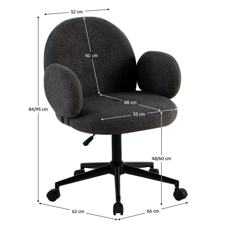 Kancelářská židle TURIO je ideálním řešením pro ty, kteří hledají styl a komfort v jednom. Čalounění z Bouclé látky v šedé barvě přináší do vašeho pracovního prostoru nadčasový vzhled. Černá kovová podstava s kolečky zajišťuje plynulý pohyb a vytváří moderní kontrast s elegantním čalouněním. Otočný mechanismus zaručuje flexibilitu při každé činnosti, ať už při práci, videohovorech nebo relaxaci.