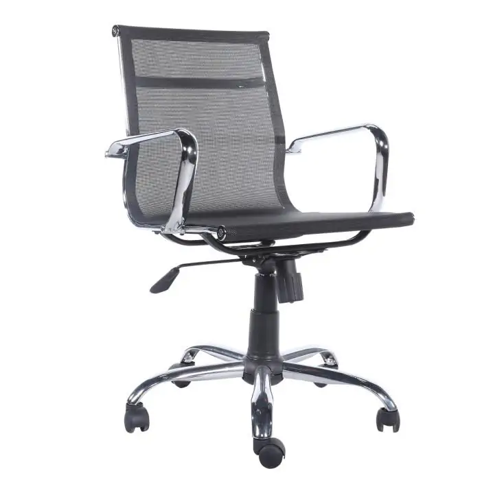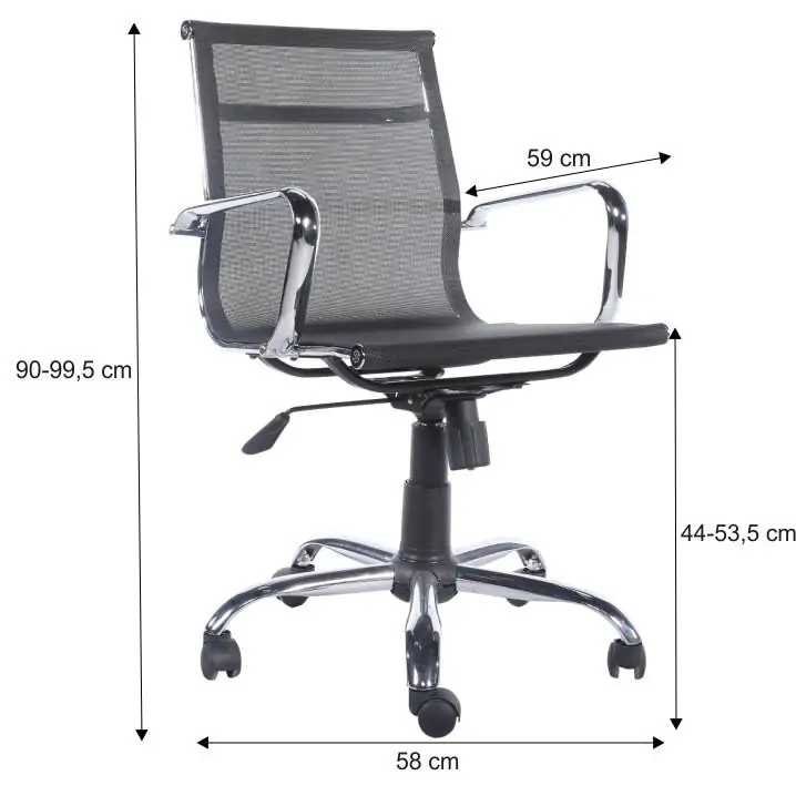Výškově nastavitelná kancelářská židle s područkami. Sedák a opěrák židle je z černé prodyšné síťoviny. Kříž židle s kolečky je chromový a područky jsou také chromové. Područky jsou čalouněné.