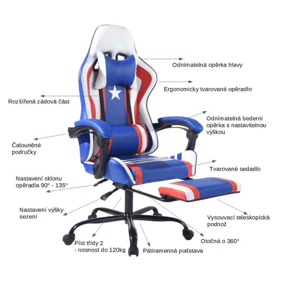 UPOZORNĚNÍ : rozbaleno - k dispozici 1 kus Herní křeslo inspirované superhrdinou Captain America. Nabízí několik funkcí jako je polohovací opěrka zad, nastavitelná výška sedu, opěrka...