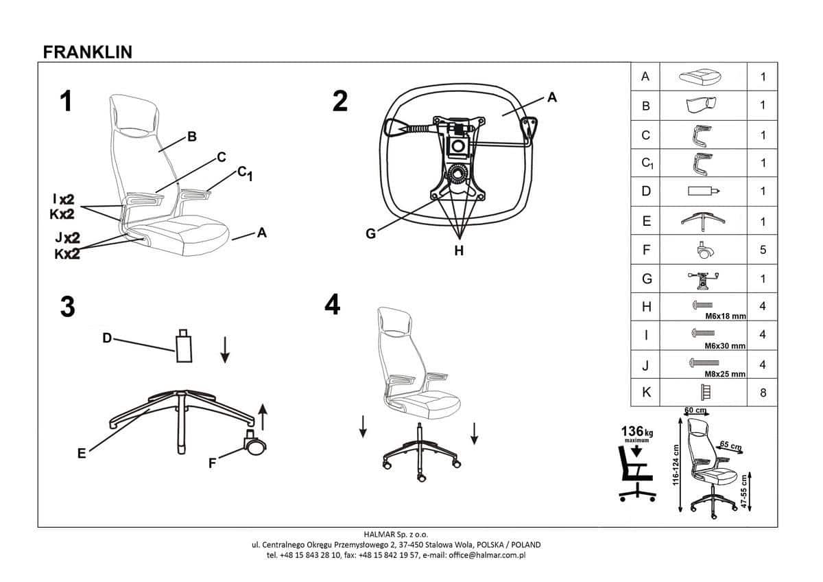 Provedení: Moderní kancelářská židle Franklin je vybavena bílými područkami a bílým pětiramenným křížem s kolečky. Je otočná a výškově nastavitelná. Obsahuje mechaniku Tilt, což je obdoba klasické...