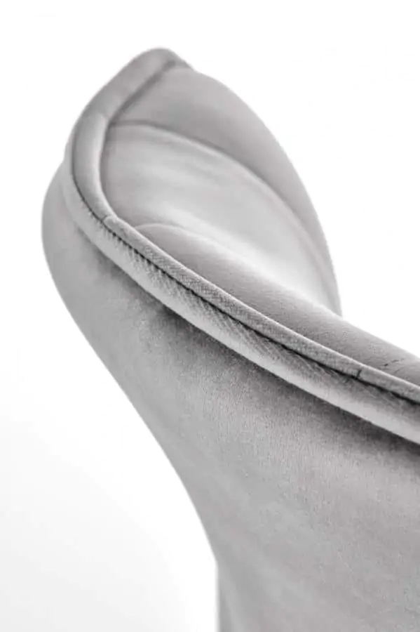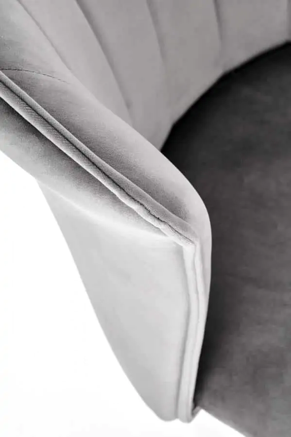 Stylová kancelářská židle ve tvaru mušle je čalouněná šedou látkou.