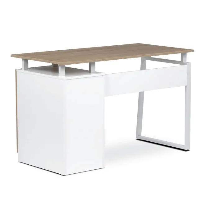 Pevné kovové nohy v bílé barvě poskytují stabilní oporu a dodávají celku industriální nádech. Tři prostorné zásuvky s kovovými úchytkami umožňují efektivní organizaci pracovních potřeb. Rozměry 120x60x75 cm nabízejí dostatek prostoru pro práci i uložení dokumentů.