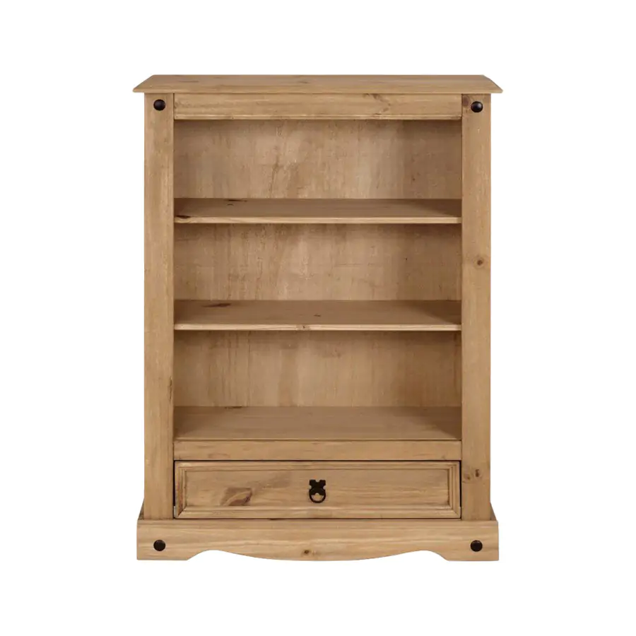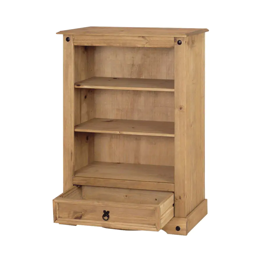 Knihovna Corona 3 s 1 zásuvkou je vyrobená z masivní borovice. V barevném provedení voskování medové barvy. V regálu naleznete 2 police a pod nimi 1 zásuvku. Zásuvku zdobí černé kovová úchytka....