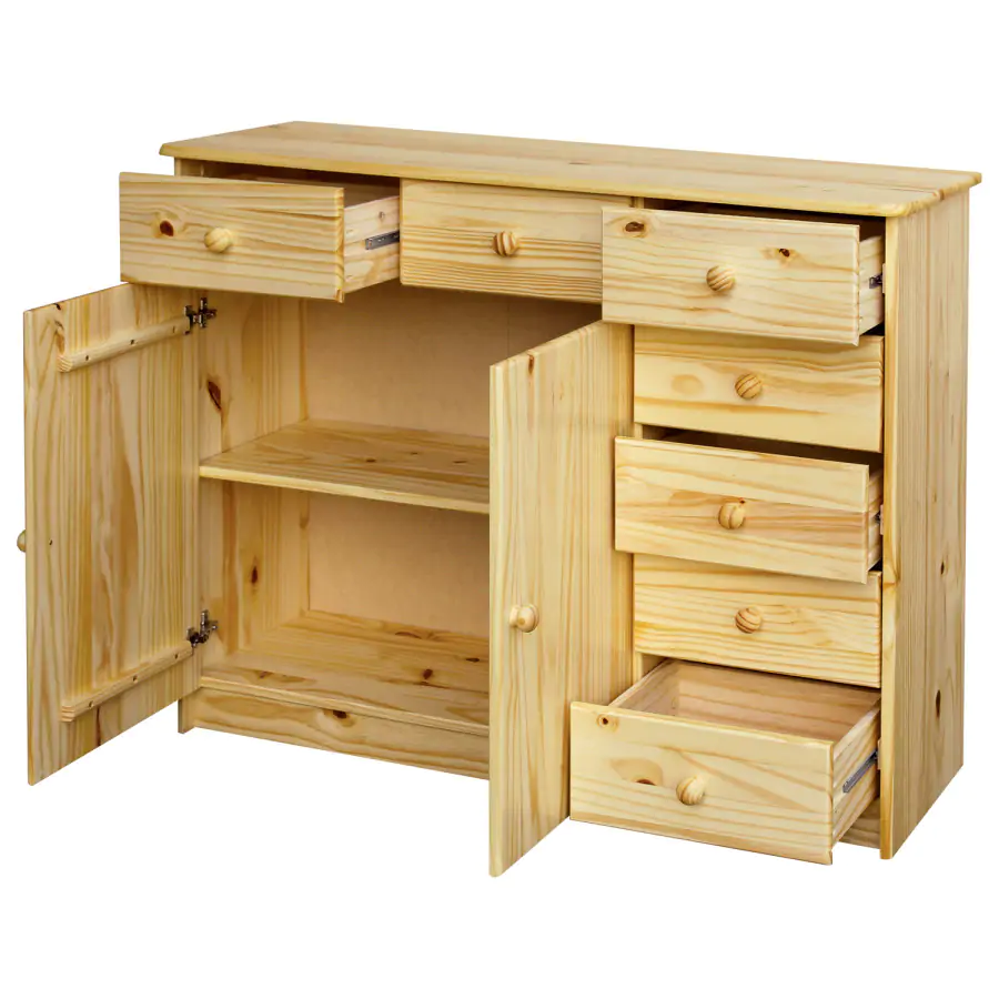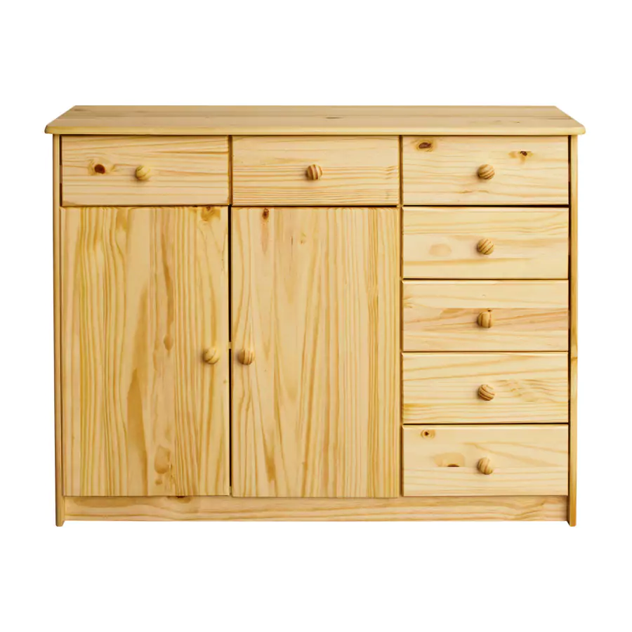 Praktická komoda je vyrobena z masivní borovice v lakovaném provedení. Díky přírodnímu provedení vynikne barva dřeva.