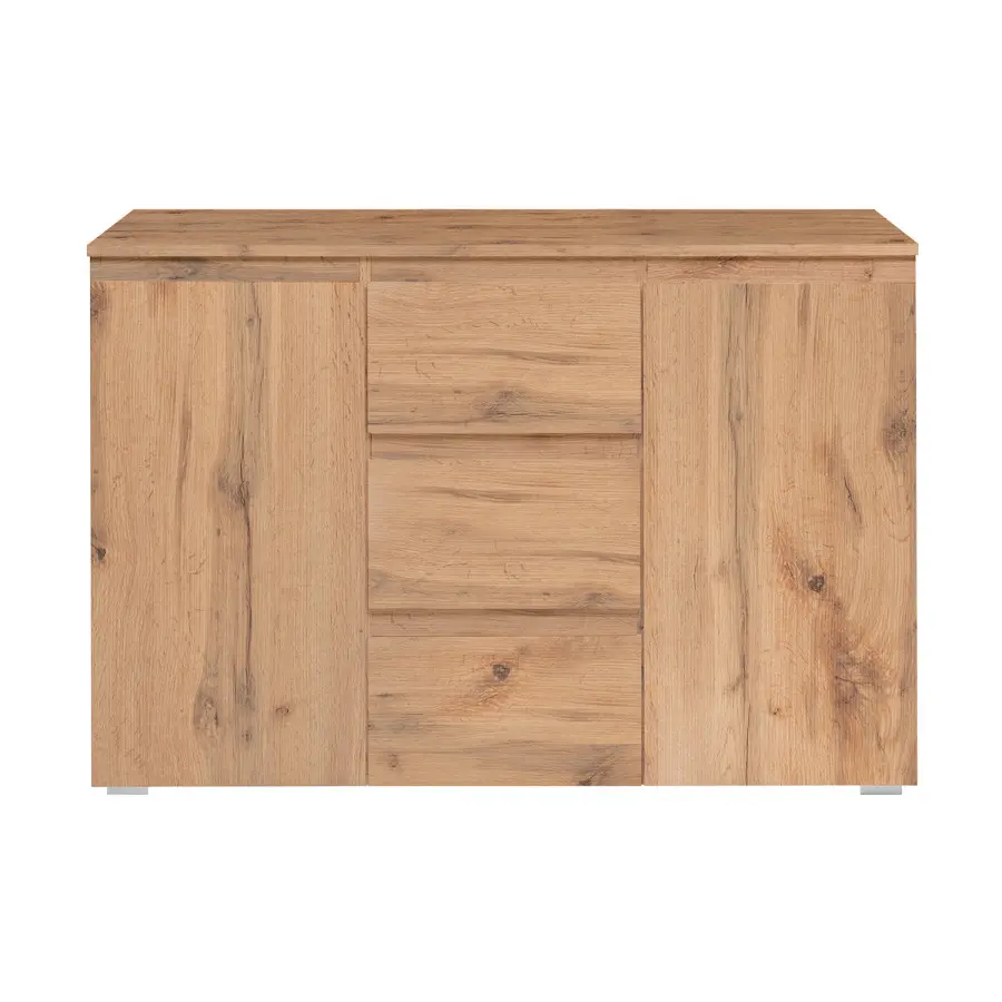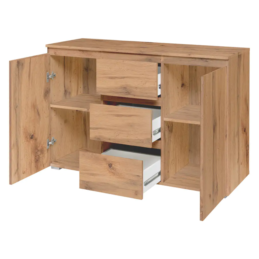 Hladká komoda obsahuje dva úložné prostory s dvířky, za kterými se nacházejí dvě police a uprostřed komody jsou tři zásuvky s kovovými pojezdy.