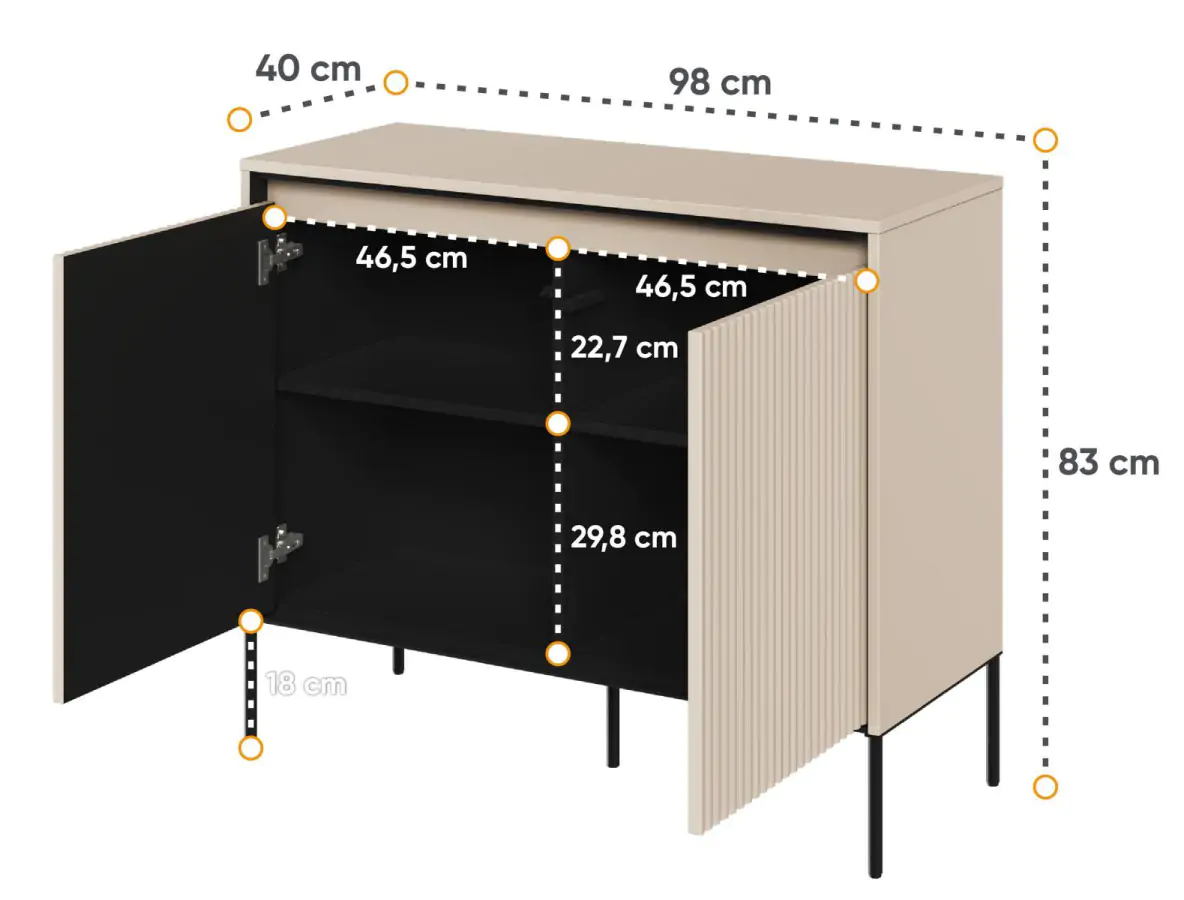 - přední strana MDF 18 mm s půlválcovým frézováním, vše hraněno ABS páskou 1 mm,