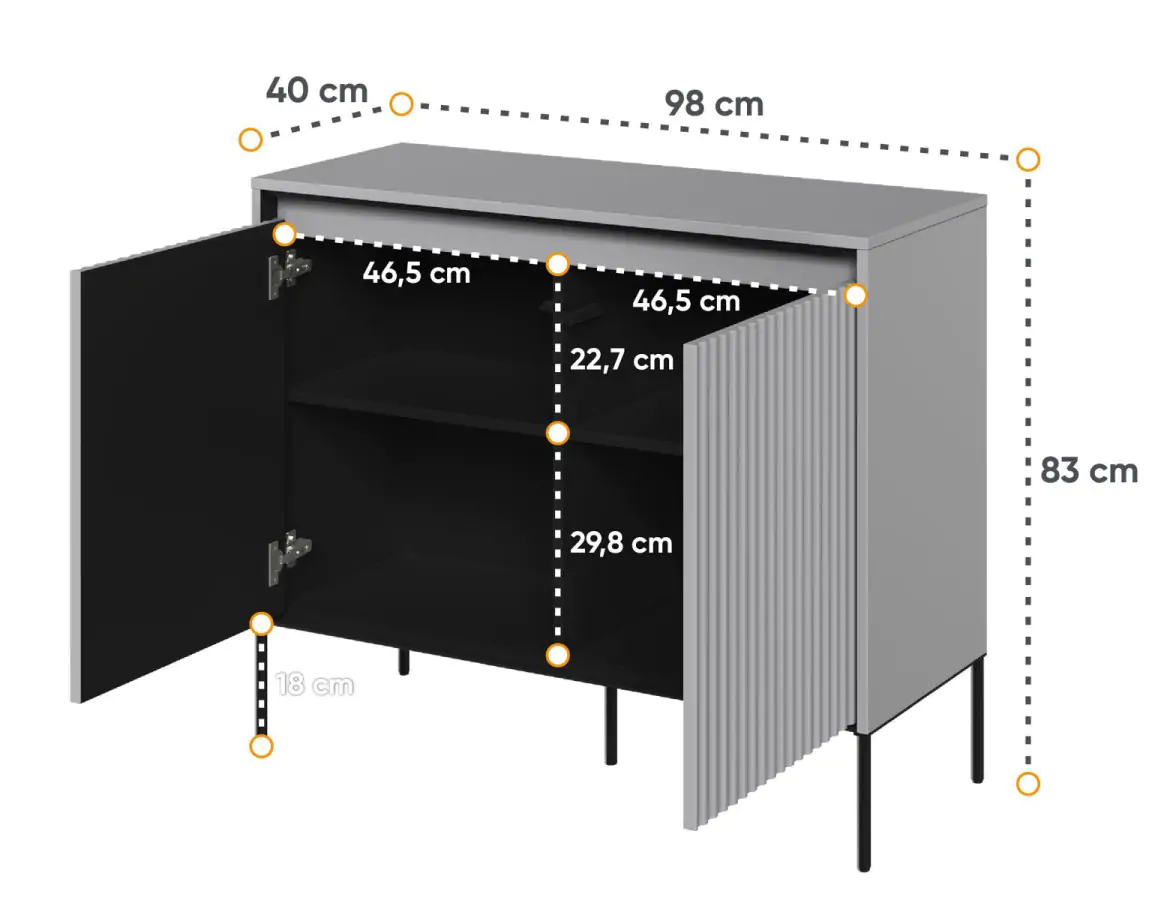 - přední strana MDF 18 mm s půlkruhovým frézováním, vše hraněno ABS páskou 1 mm,