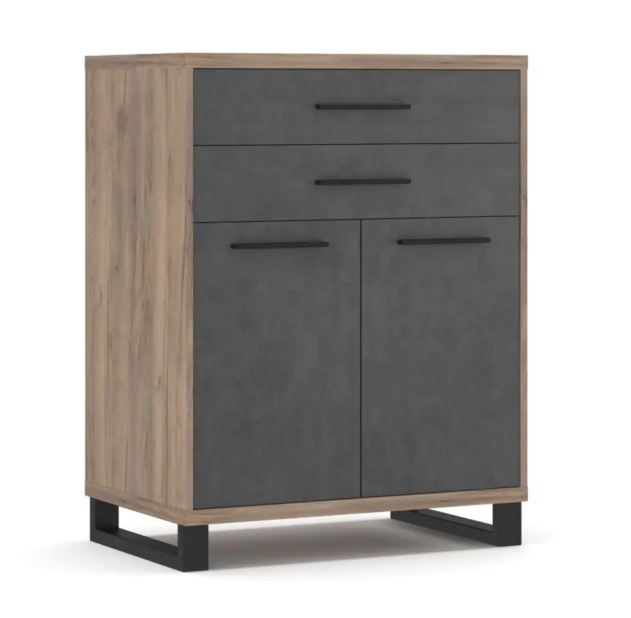 Komoda dvoudveřová ROSOLINI se dvěma zásuvkami v industriálním stylu je vyrobena z kvalitní LTD v barevném provedení dub tabaco/matera. Pevné kovové nohy podtrhují loftový ráz nábytku. Úchyty jsou...