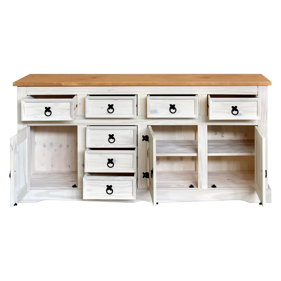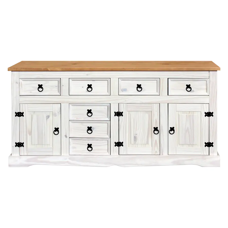 Komoda 3 dveře + 7 zásuvek CORONA v provedení masiv borovice, voskovaná v bílém odstínu, krásně zapadne mezi ostatní masivní nábytek Corona bílá, lze ji však umístit i samostatně.