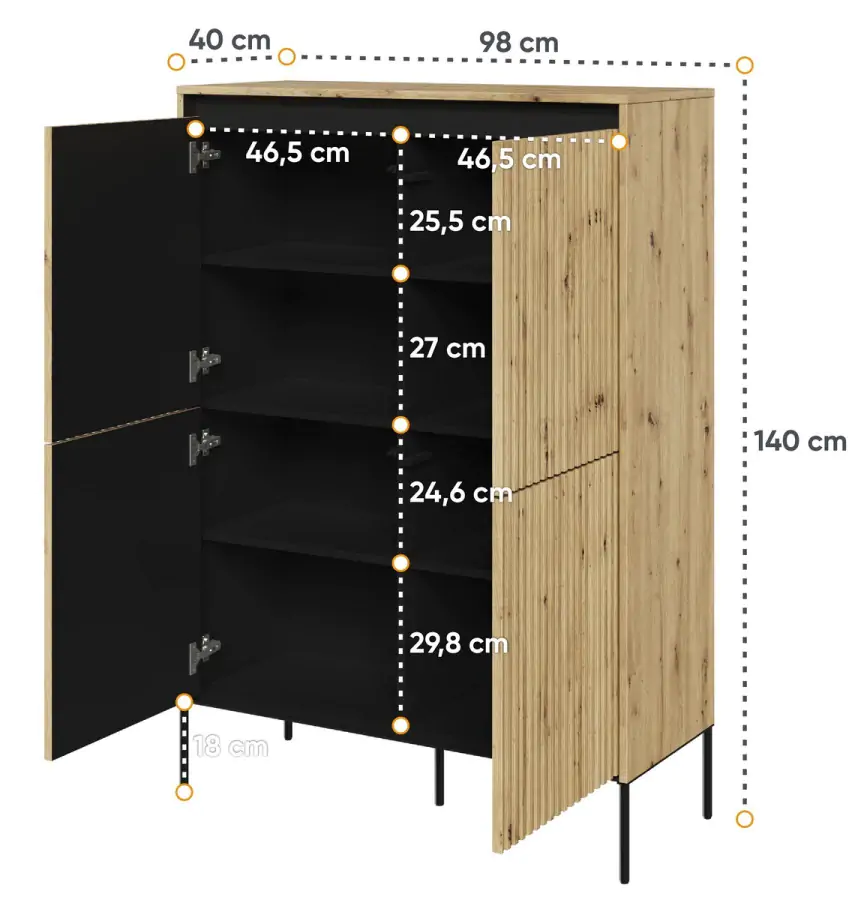 - přední strana MDF 18 mm s rovným frézováním, vše hraněno ABS páskou 1 mm,