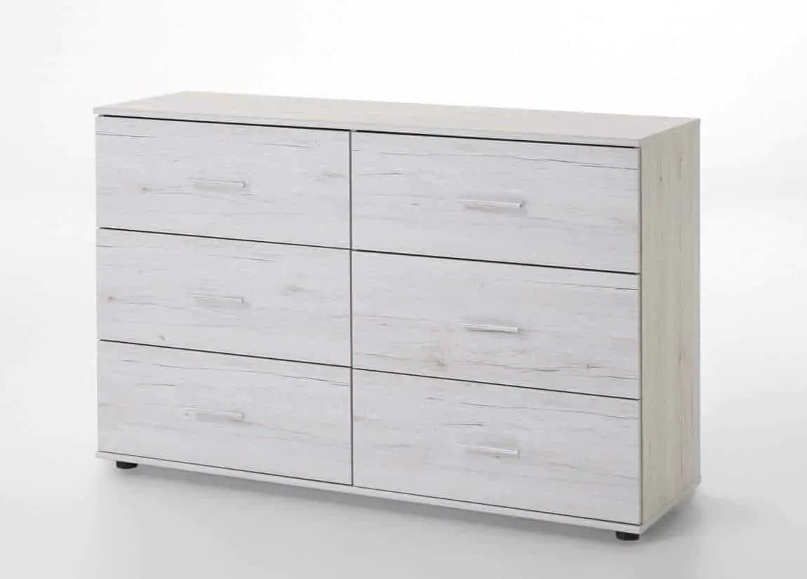 Komoda v moderním provedení z ložnicové kolekce SUSAN. Komoda obsahuje 6 praktických zásuvek. Korpus i dvířka jsou z kvalitní LTD v atraktivní barvě bílý dub. Úchyty jsou z plastu. Tento...