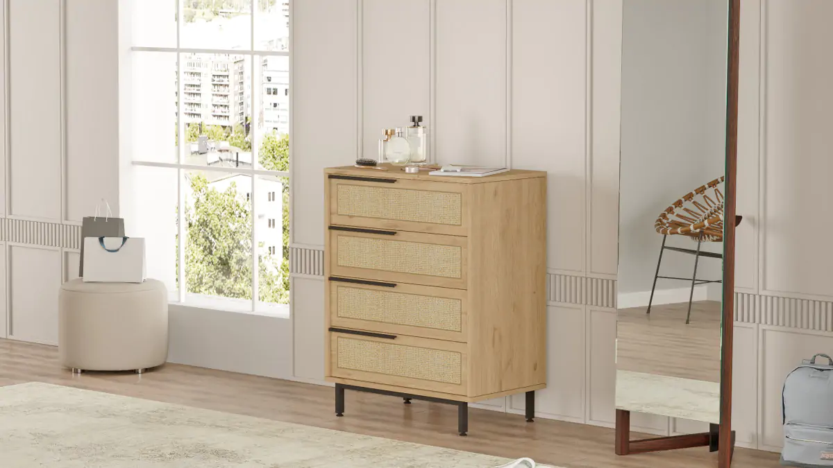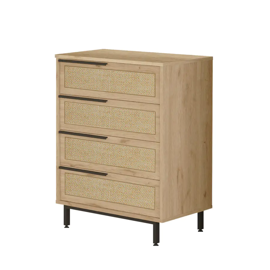 Kombinuje praktičnost a moderní estetiku. Čtyři prostorné zásuvky poskytují úložný prostor pro oblečení, dokumenty, dekorace nebo další nezbytnosti. Díky svým kompaktním rozměrům a nožičkám se snadno hodí do různých interiérů, přičemž dodává místnosti elegantní a sofistikovaný vzhled.