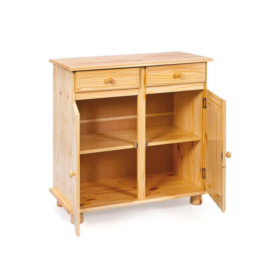 Tento příborník má dvoje dveře, za nimiž najdeme jednu polici a dvě zásuvky s kovovými pojezdy.