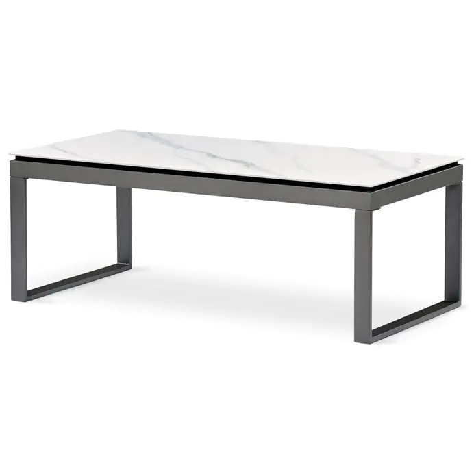 Industriální design stolku AHG-284 WT je uzemněn robustními kovovými nohami v šedé barvě, které jsou konfigurovány do obvodové základny zajišťující stabilitu a odolnost. Tento prvek podpírá bílou keramickou desku s dekorem mramoru.