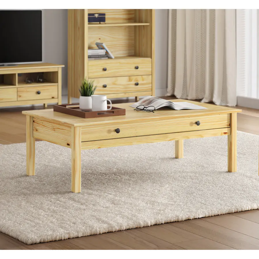 Konferenční stolek TORINO 8092K v přírodním provedení z masivní borovice je skvělým společníkem do každého světle zařízeného obýváku. Stolek je vybaven širokou zásuvkou s kovovými pojezdy. Díky ní nemusíte mít všechny věci odložené na stolku a jednoduše je do zásuvky schováte, aby nebyly na očích.
