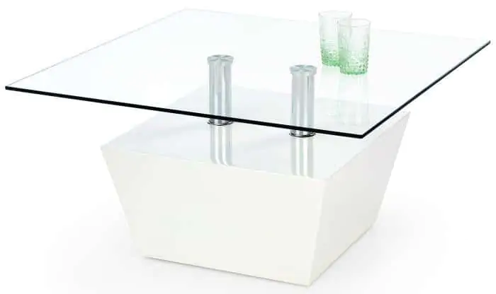 Tento čtvercový stolek je vyroben v kombinaci robustní podnože z bíle lakované MDF a skleněné desky. Deska je na podnož upevněna pomocí kovových výztuží.
