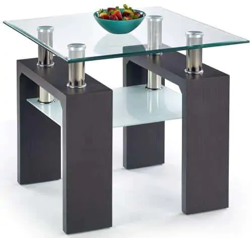 Čtvercový konferenční stolek Diana H s praktickou odkládací poličkou je vyroben v kombinaci skla, laminované MDF a chromovaných prvků.