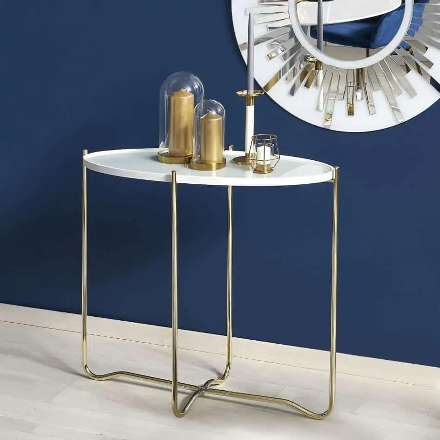 Konferenční stolek z lakované MDF v bílé barvě. Konstrukce stolku je z chromované ocele - barva zlatá.