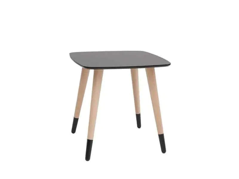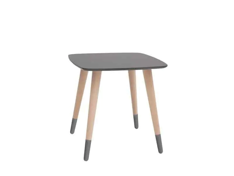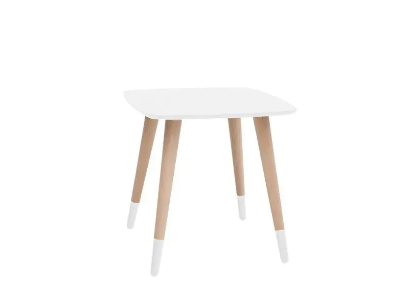Deska stolku má čtvercový tvar s jemně zaoblenými rohy, je ošetřena lakem, což zajišťuje zvýšenou odolnost desky protí poškrábaní.