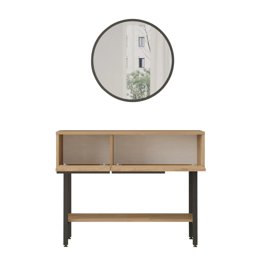 Konzolový stolek je ideálním doplňkem pro moderní obývací pokoj nebo předsíň. Spojení kvalitního LTD materiálu a kovu zajišťuje dlouhou životnost a atraktivní vzhled. Tento stolek s obdélníkovým tvarem, zrcadlem, dvěma plnými dvířky a odkládací policí přináší kombinaci praktičnosti a elegance.