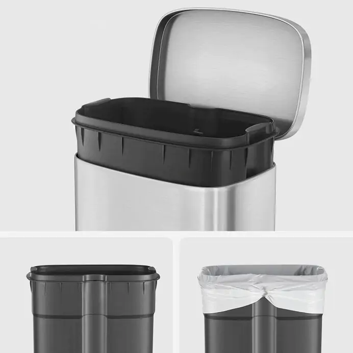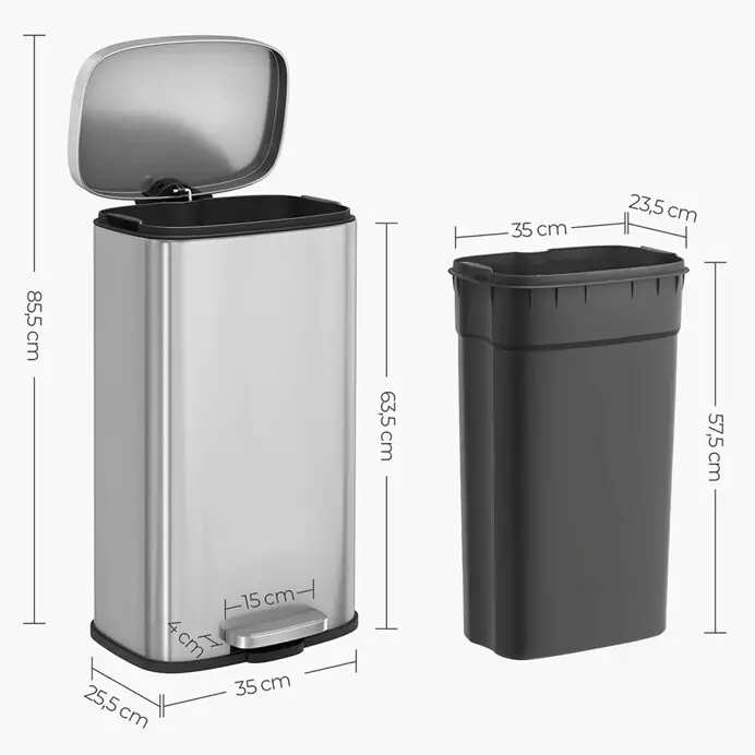 Praktický pedál umožňuje hygienické otevírání víka bez použití rukou, což zvyšuje komfort a čistotu při používání. Koš má stabilní základnu s protiskluzovou úpravou, která zajišťuje pevné postavení na podlaze. Jeho hladký povrch se snadno udržuje a odolává běžnému opotřebení, což přispívá k dlouhé životnosti produktu.