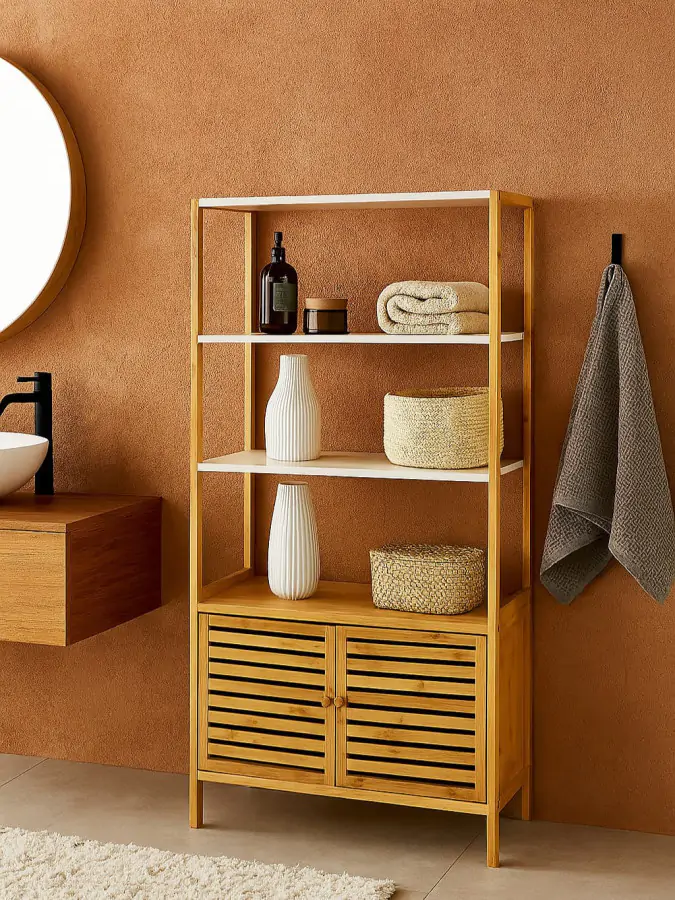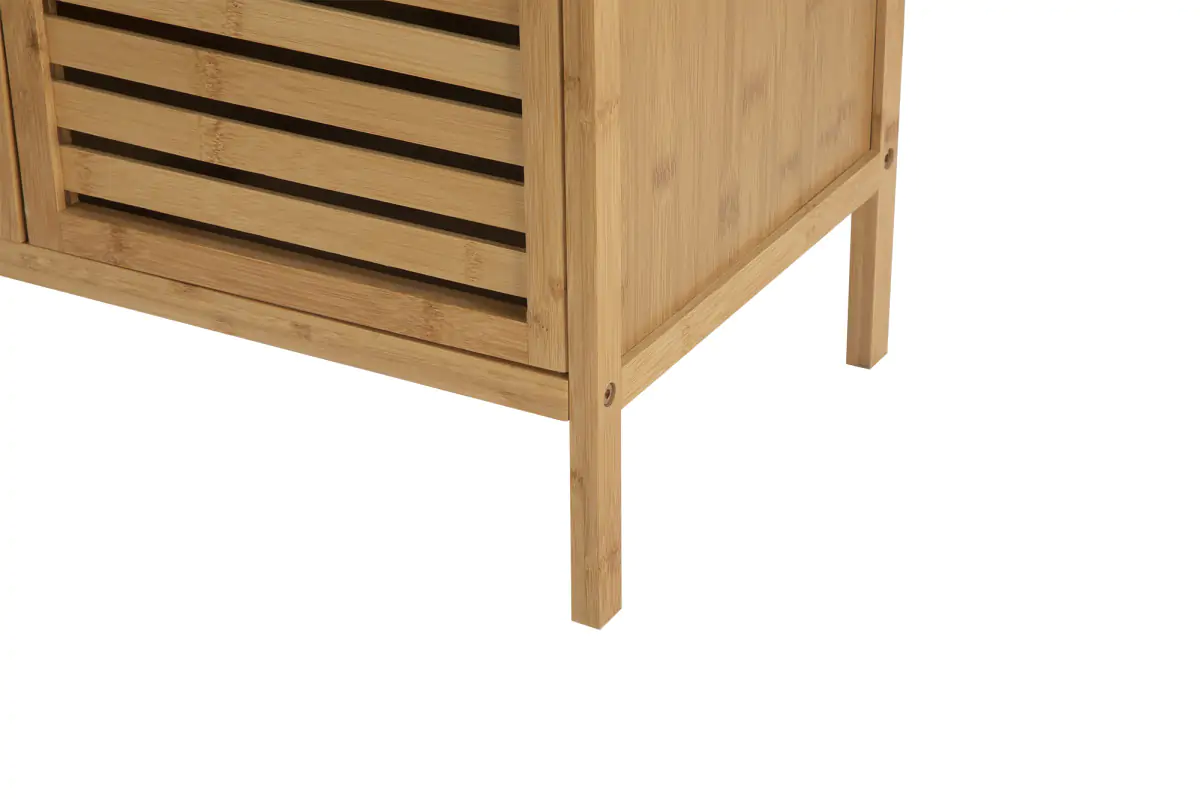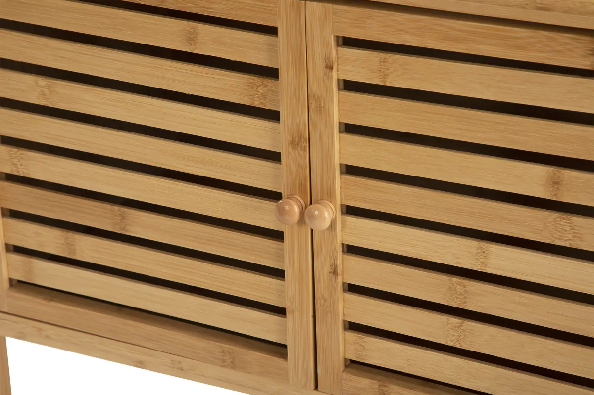 Tři horní police vhodné pro vystavení nebo uložení potřebných věcí. Spodní část s dvířky s lamelovým designem, umožňující větrání uložených věcí. Kombinace bambusové konstrukce a bílých polic pro moderní vzhled.