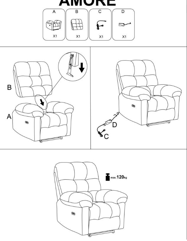 Relaxační křeslo AMORE má nosnost 120 kg a nabízí stabilní konstrukci i dlouhou životnost. Ideální volba pro ty, kteří chtějí spojit pohodlí, styl a moderní technologii v jednom kousku nábytku.