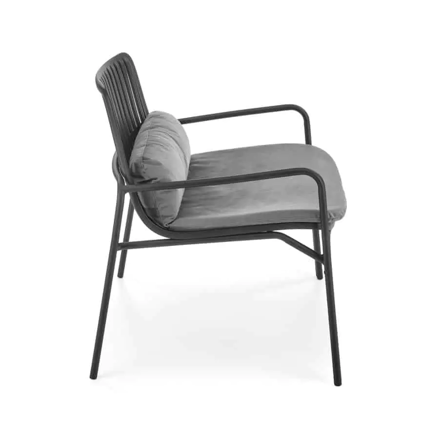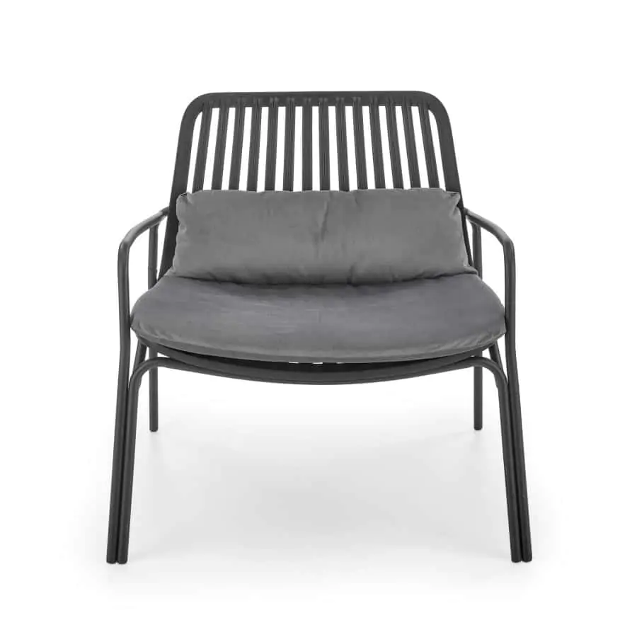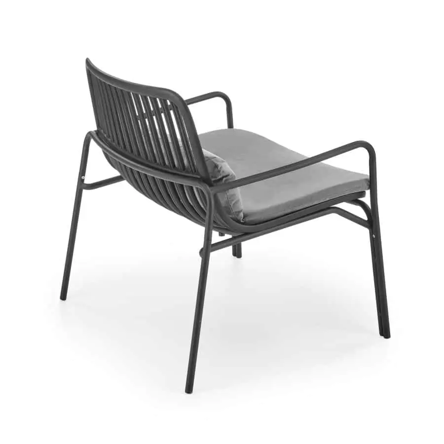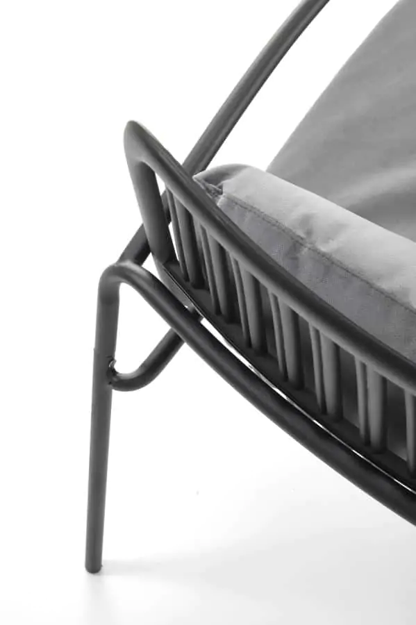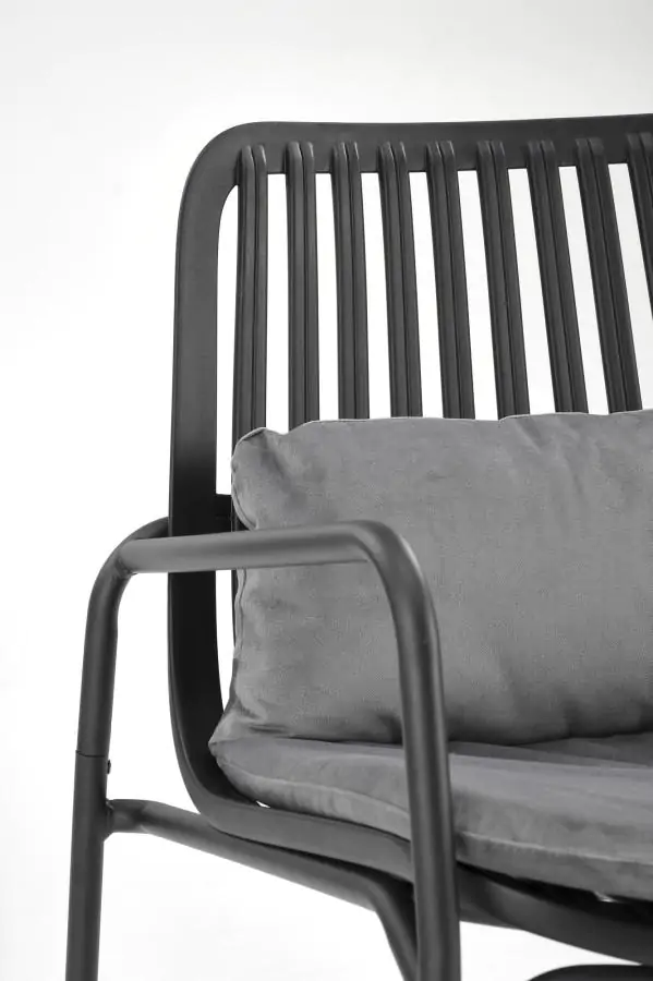 S černým kovovým rámem a čalouněním z šedé látky se stává vynikajícím doplňkem pro relaxaci venku.