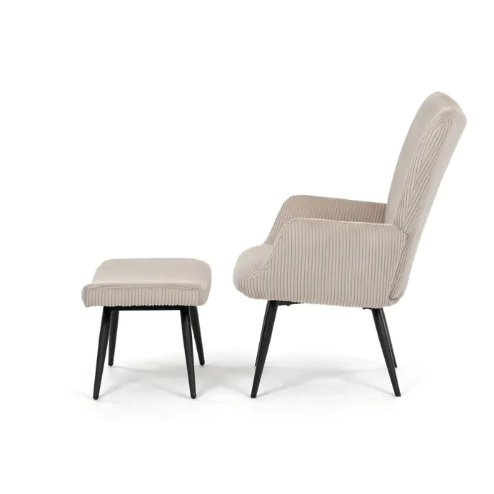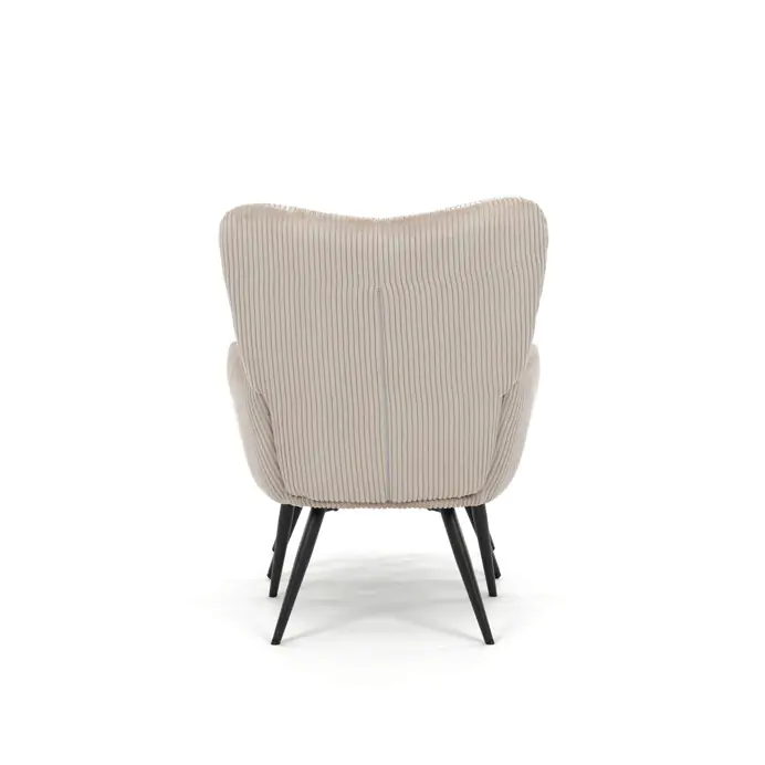 Pevné černé kovové nohy zajišťují stabilitu a dlouhou životnost. Manšestrová látka dodává křeslu příjemnou texturu a vizuální hloubku, která se hodí do moderních i klasických interiérů.