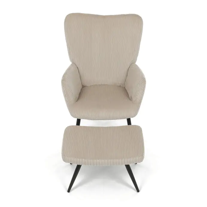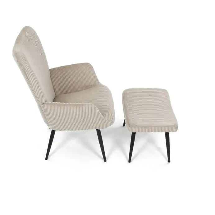 Relaxační křeslo AK-L7285 CRM6 s podnožkou v krémovém manšestru nabízí pohodlné posezení díky měkkému čalounění a ergonomicky tvarovaným područkám.