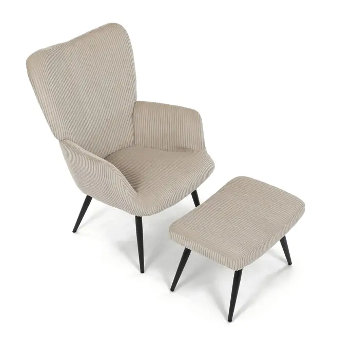 Součástí je praktický taburet pro pohodlné opření nohou, který sdílí stejný design a materiál.