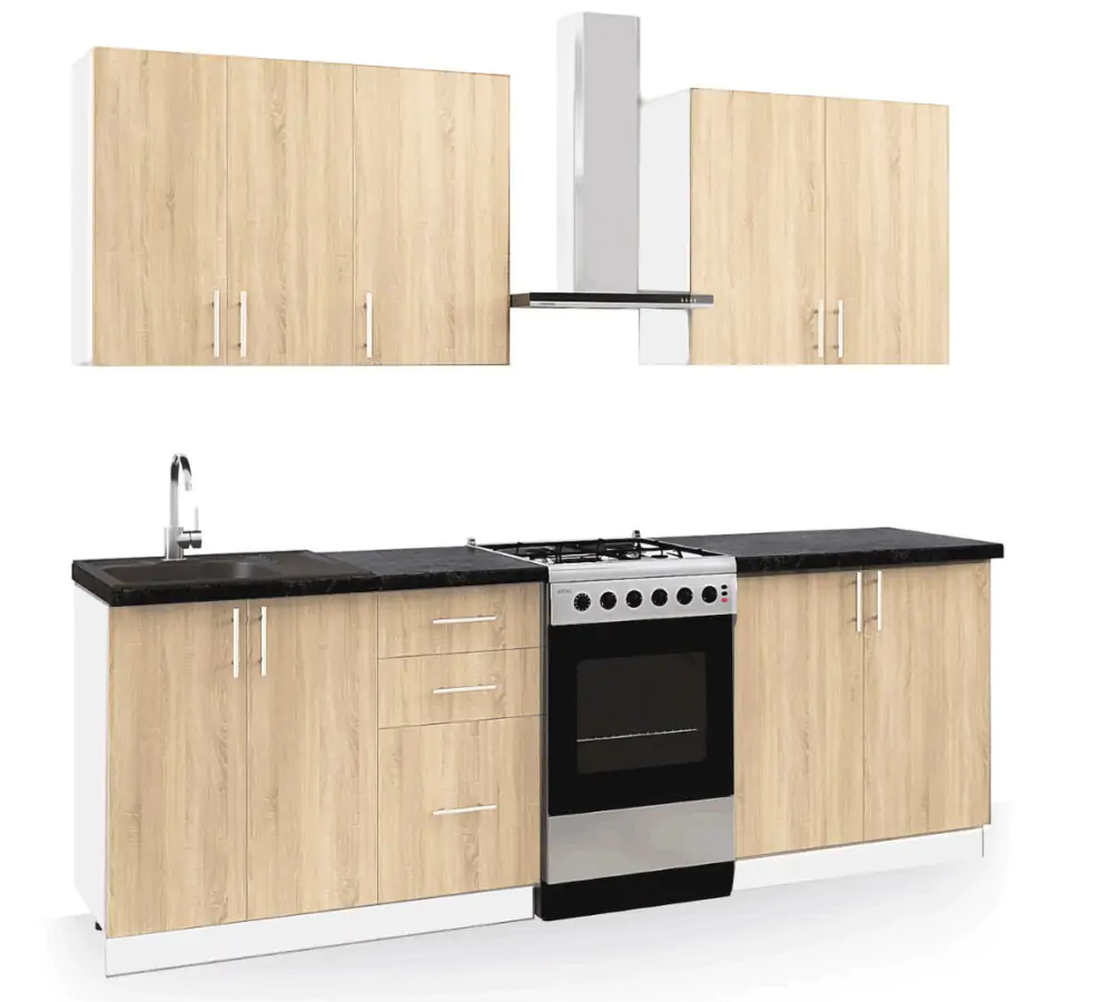 Skříňky se dají poskládat v libovolném pořadí a to Vám umožní si sestavit kuchyni podle svých představ. Korpus a sokl jsou z kvalitní LTD desky v barvě bílé, dvířka jsou v barvě dub sonoma. Úchyty jsou stříbrné plastové.