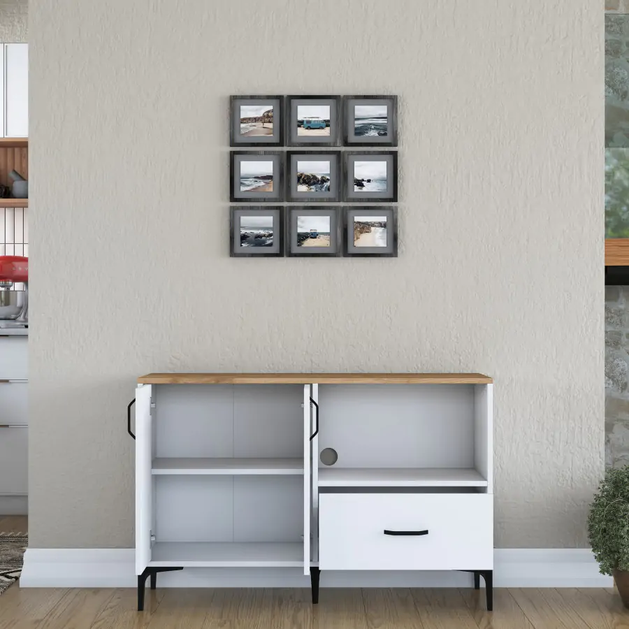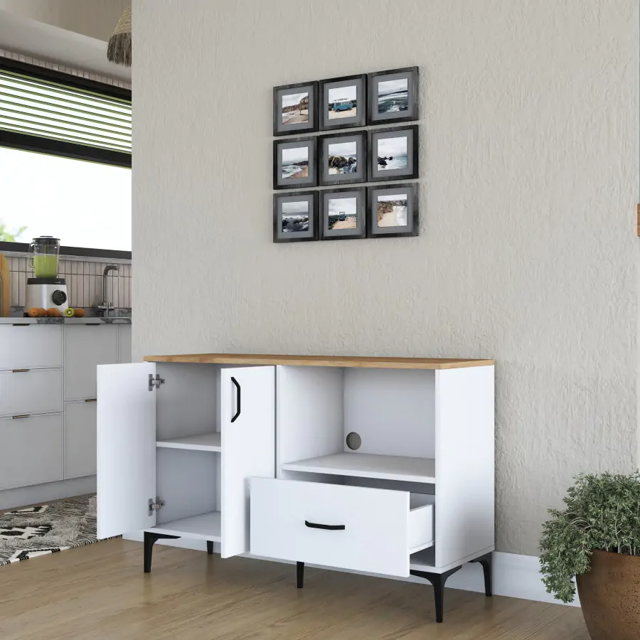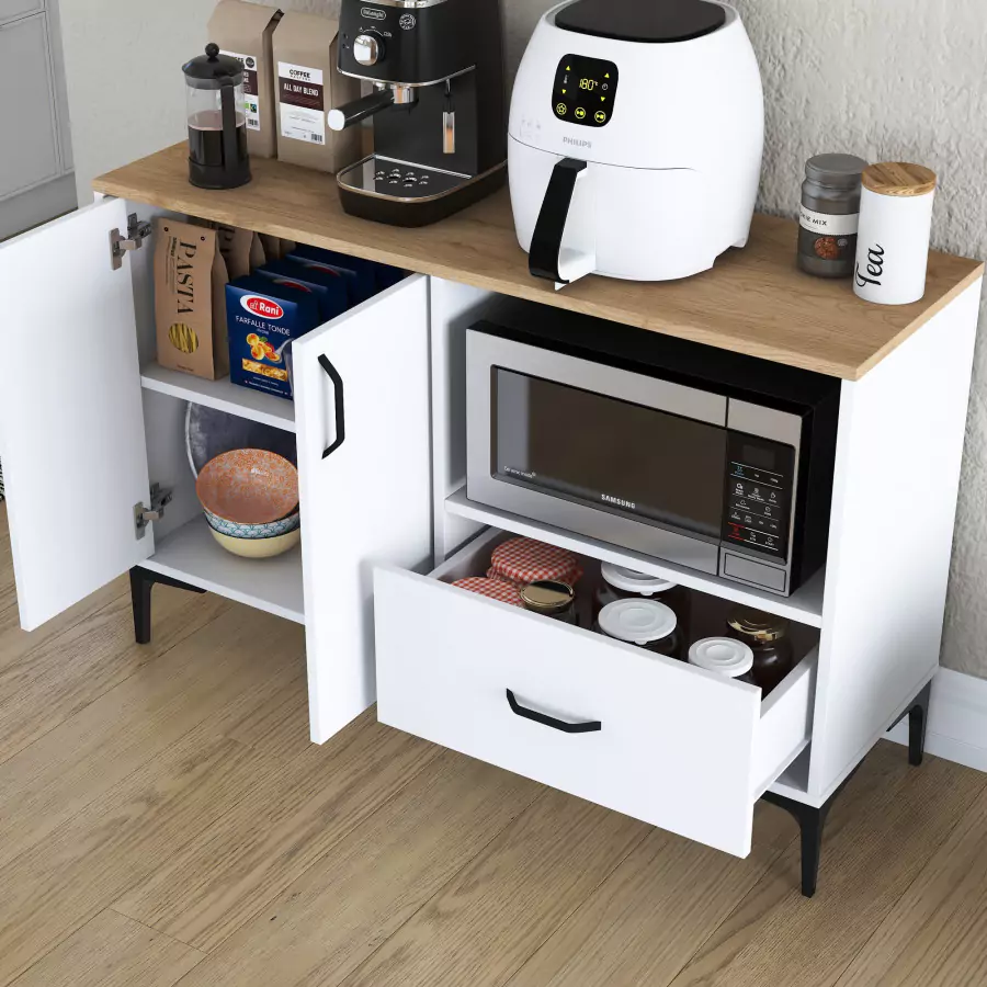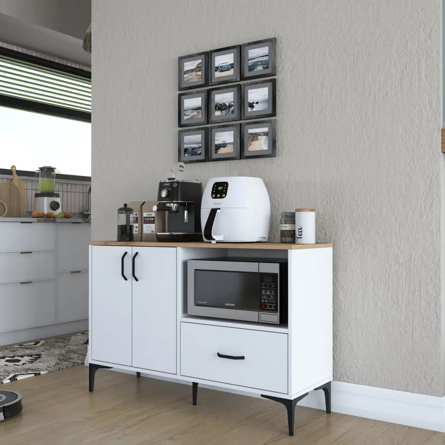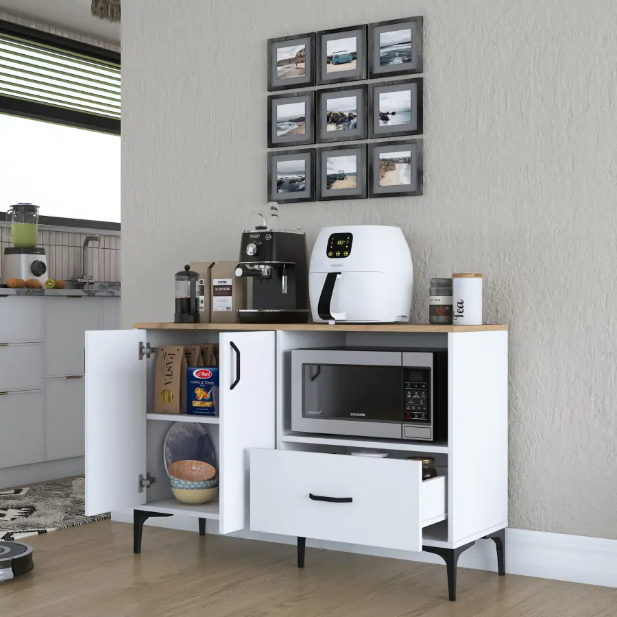 Skříňka je ideální pro umístění mikrovlnné trouby, a přitom nabízí další praktické úložné prostory. Je vybavena dvěma plnými dvířky, jednou zásuvkou a otevřeným regálkem pro snadný přístup k často používaným předmětům. Vysoce kvalitní materiály, jako melamin a VT laminát, zaručují dlouhou životnost a jednoduchou údržbu.